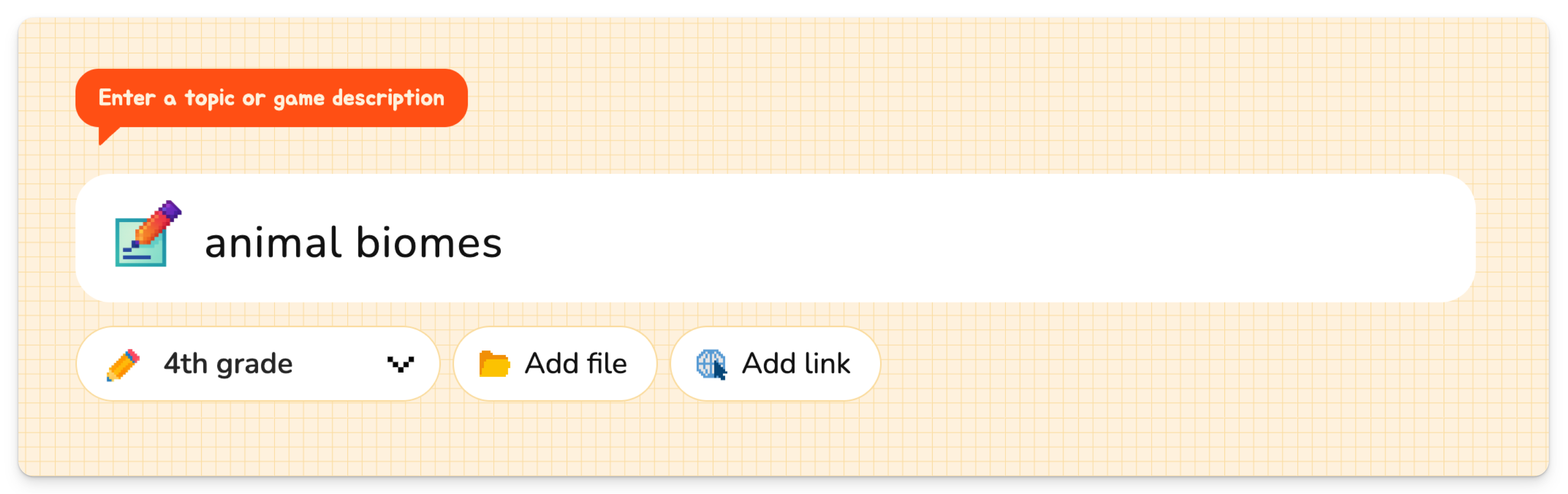 Be specific with topics. "Photosynthesis" will work, but "The light-dependent and light-independent reactions of photosynthesis for 10th grade biology" will produce a more focused, higher-quality game.