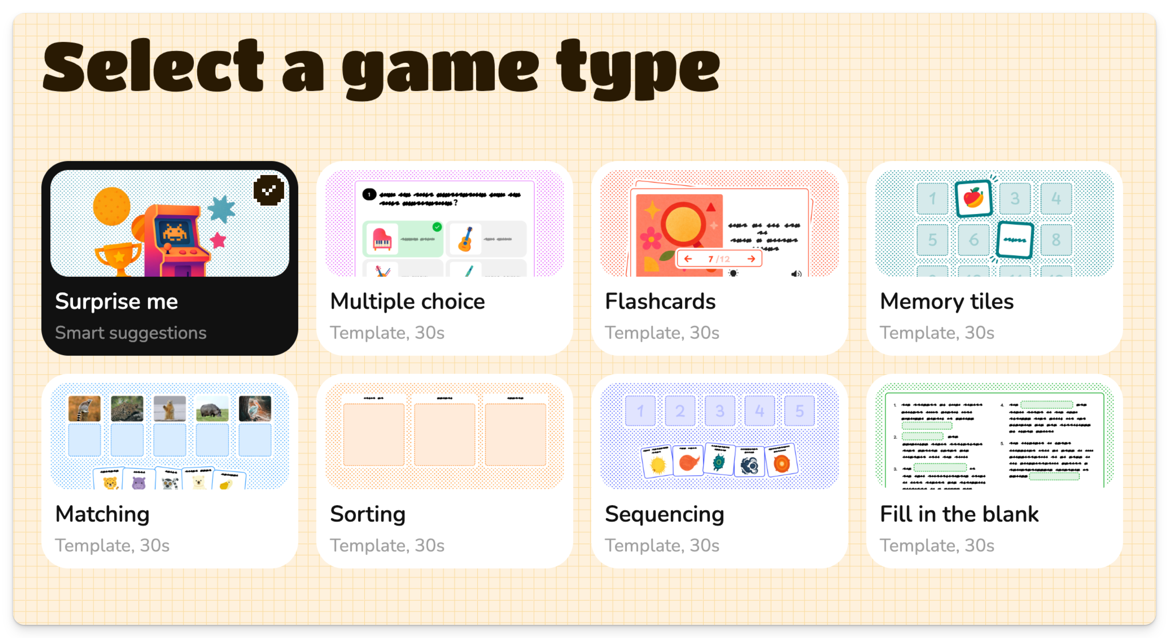- Surprise Me — Let the AI choose the best game type(s) for your content.