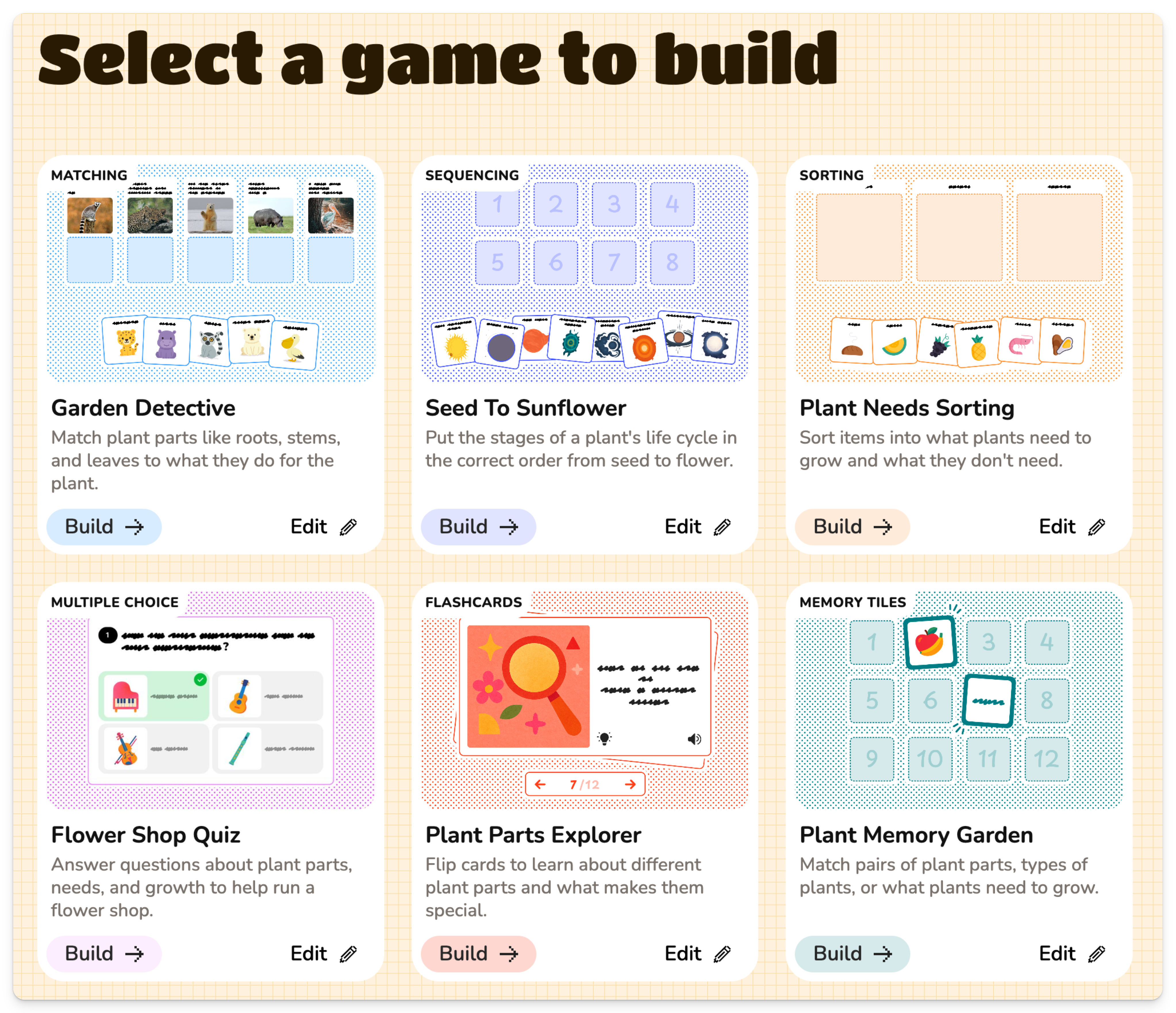 Match the game type to your content. Vocabulary and definitions work great as Matching or Flashcards. Historical events are natural fits for Sequencing. Categorization tasks are perfect for Sorting. Multiple Choice works well for comprehension questions. If you’re not sure, use Surprise Me and let the AI decide.
