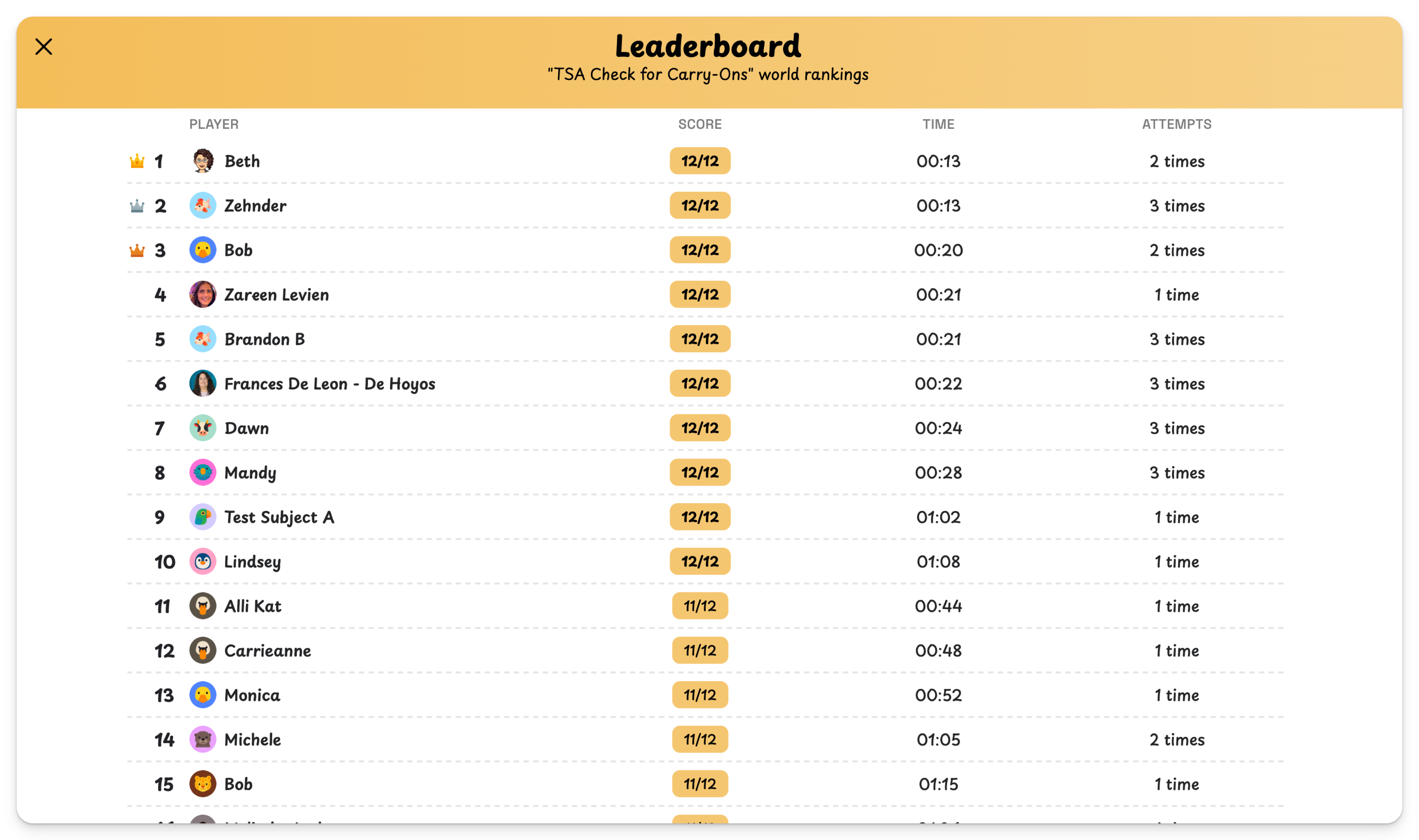 Players can see the leaderboard after completing a game, showing where they rank among everyone who’s played. As the creator, you can view the leaderboard at any time from the game’s edit view.