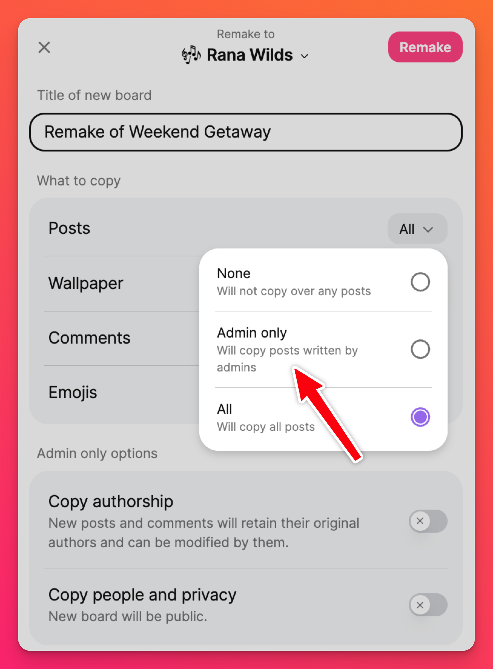 Just click the Remake button on the right-hand side of the padlet. Next to 'Posts,' click the drop-down menu and select Admin only.