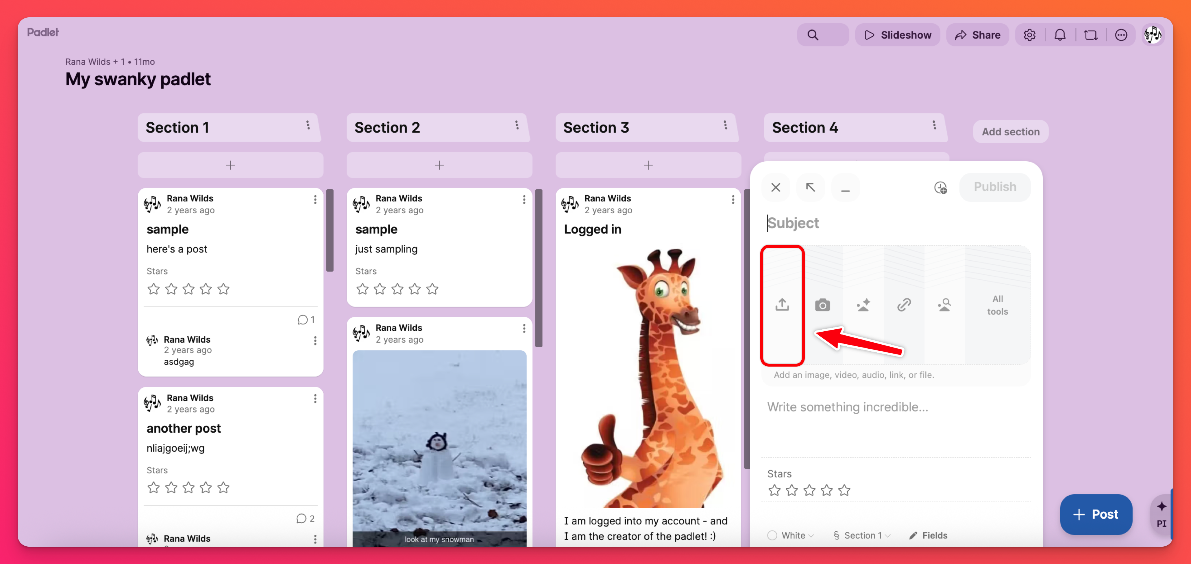 - Clicking this icon will open a new window where you can select the desired file from your device. You can also drag and drop a file from your desktop onto the post composer.