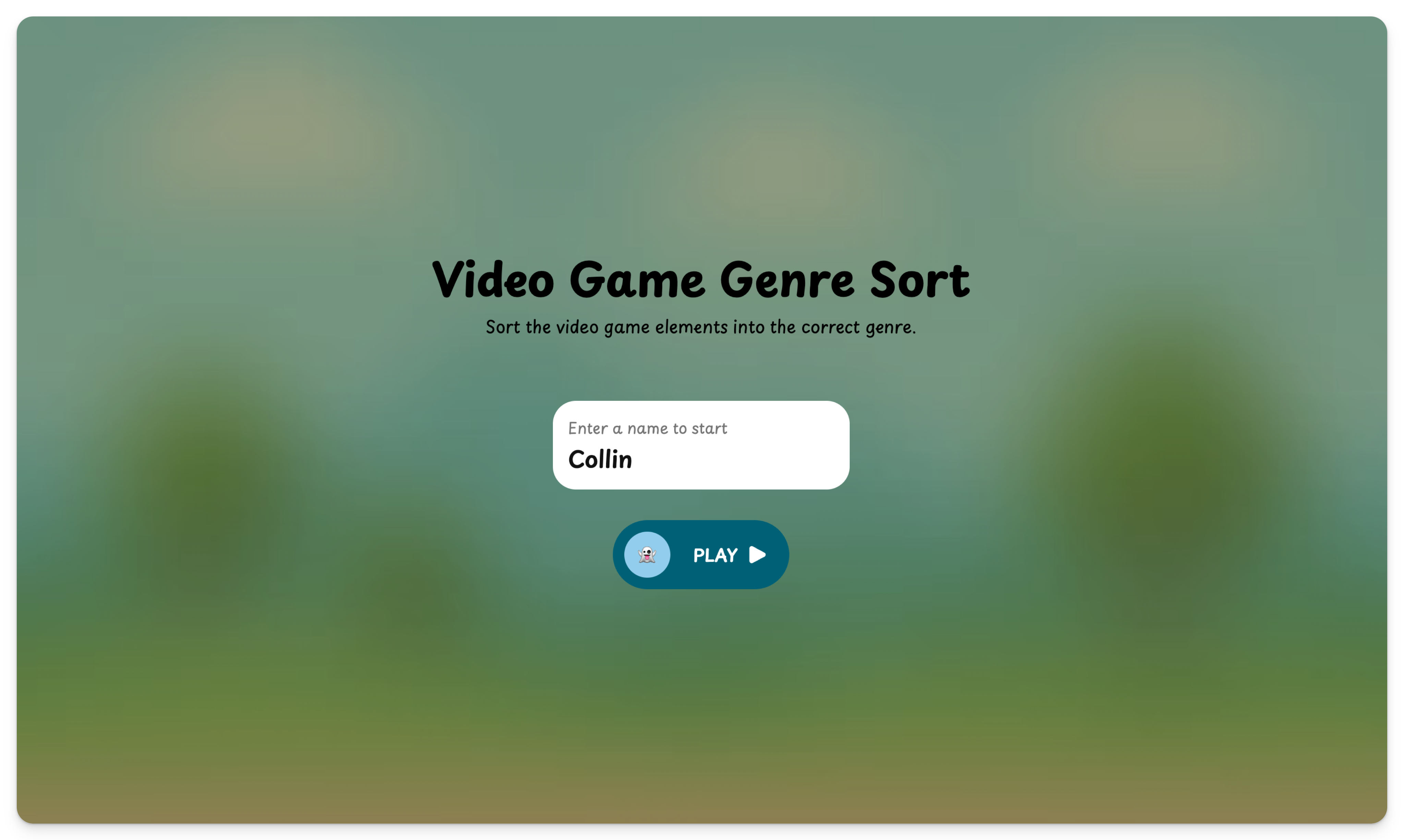 After entering their name, players see an animated play button. Clicking it launches the full-screen game. The game environment features themed visuals and backgrounds that match the subject matter.