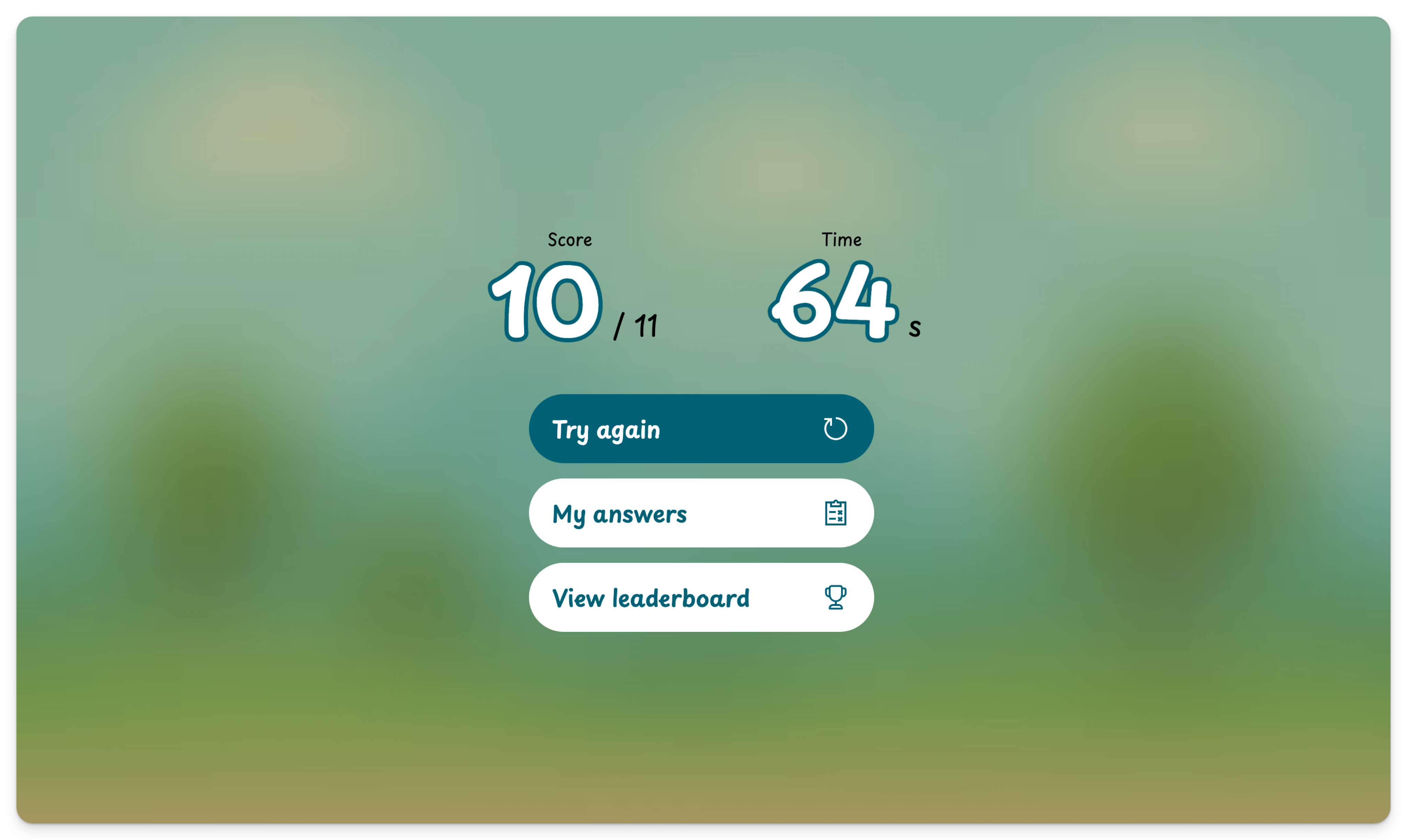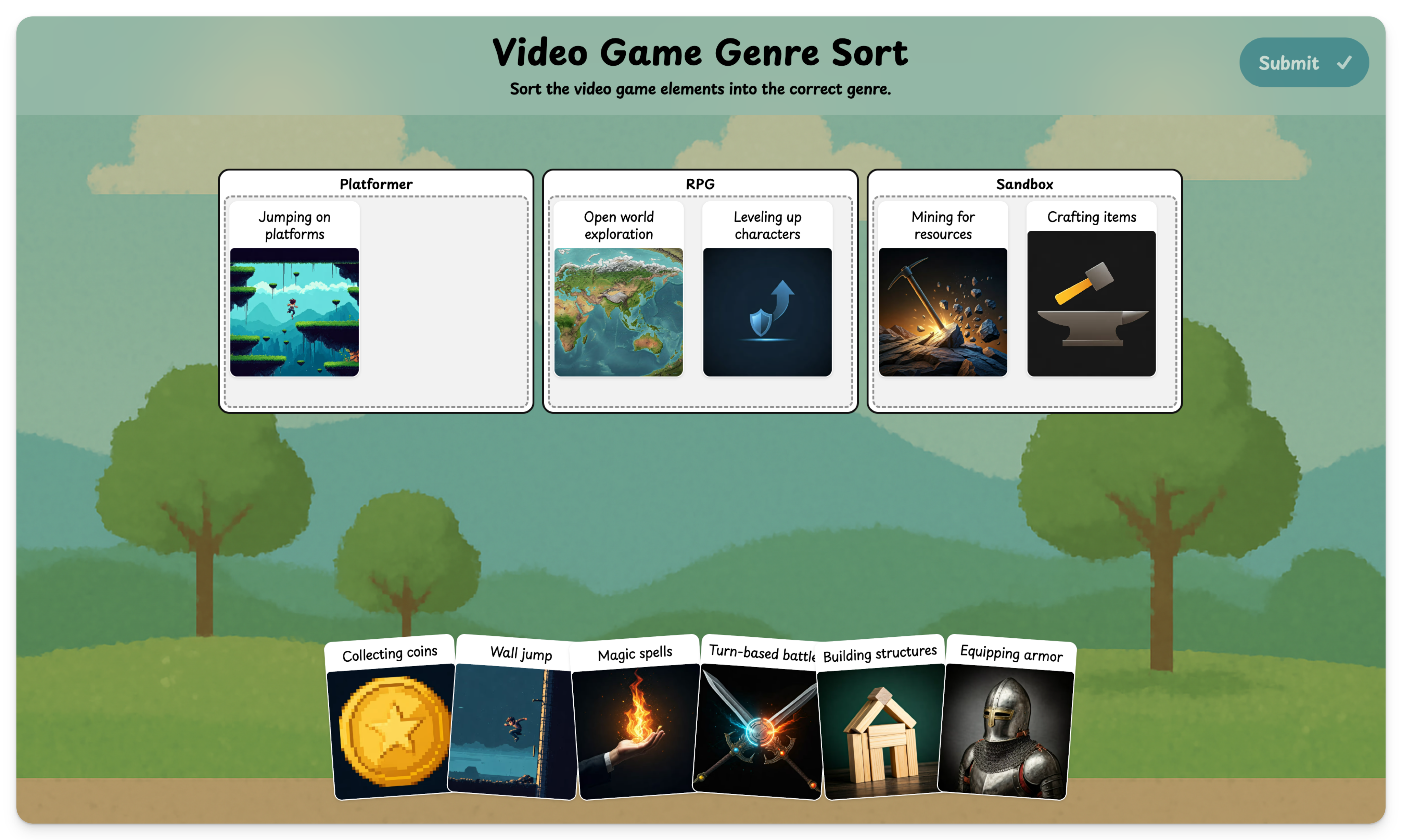 When players are done, they click the Submit button to check their answers. They’ll see their score (number of correct items) and completion time.