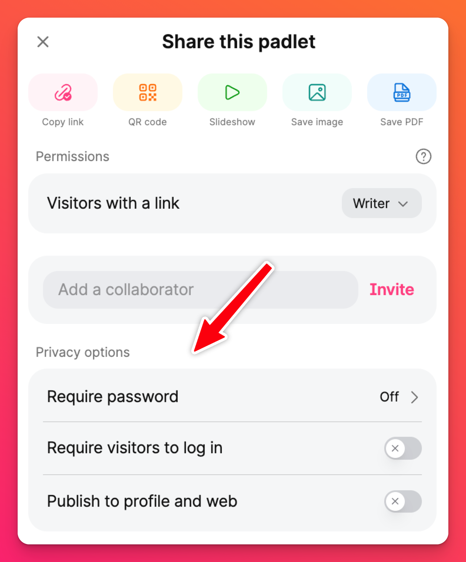 - Изискване на парола – Изисквайте от потребителите да въведат предварително зададена парола, за да имат достъп до Padlet