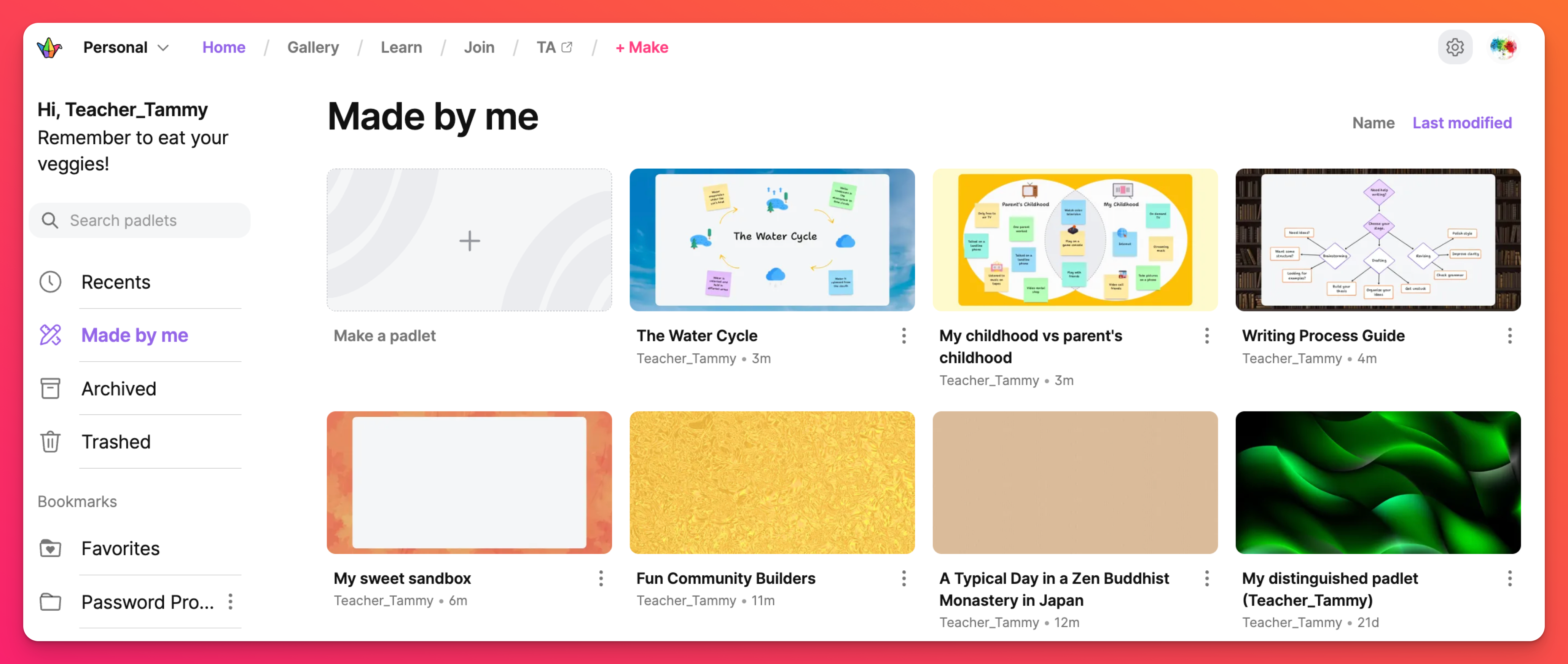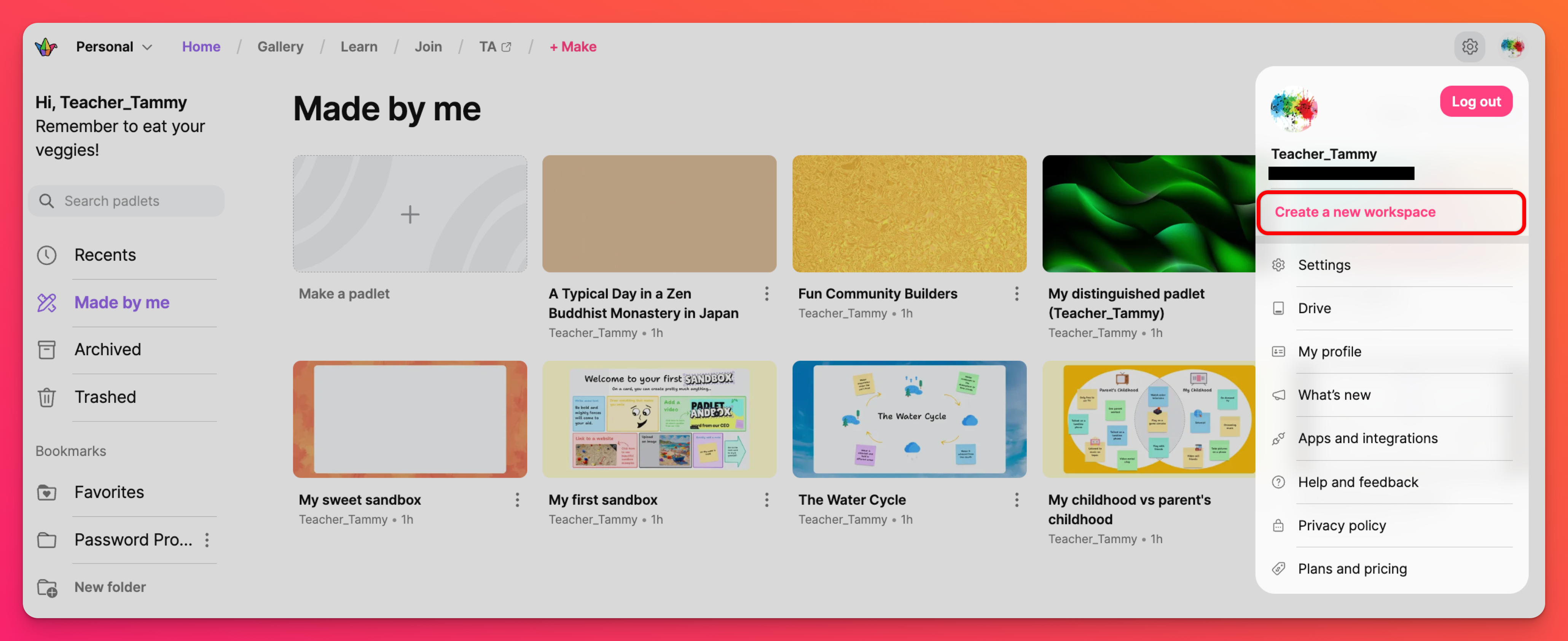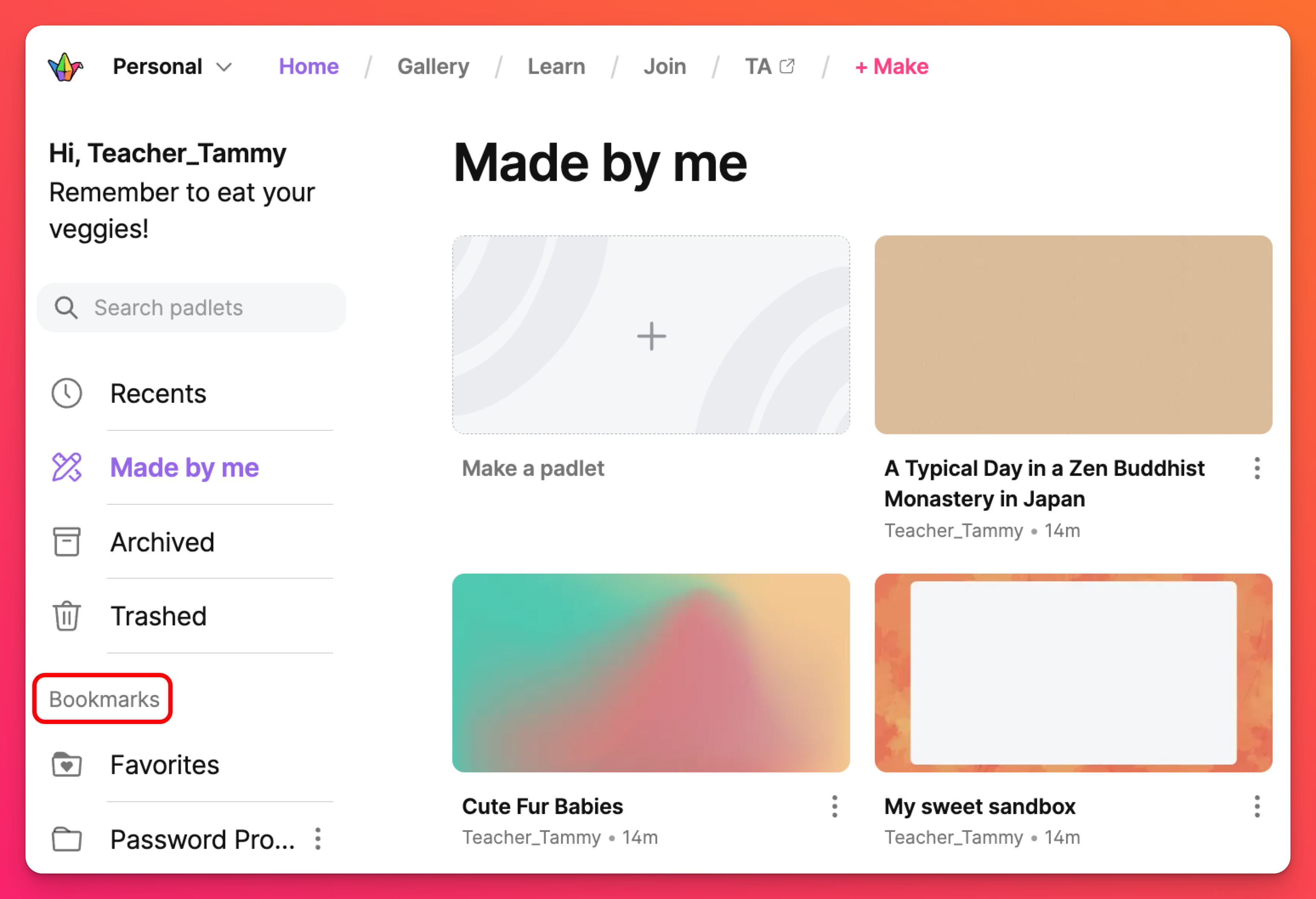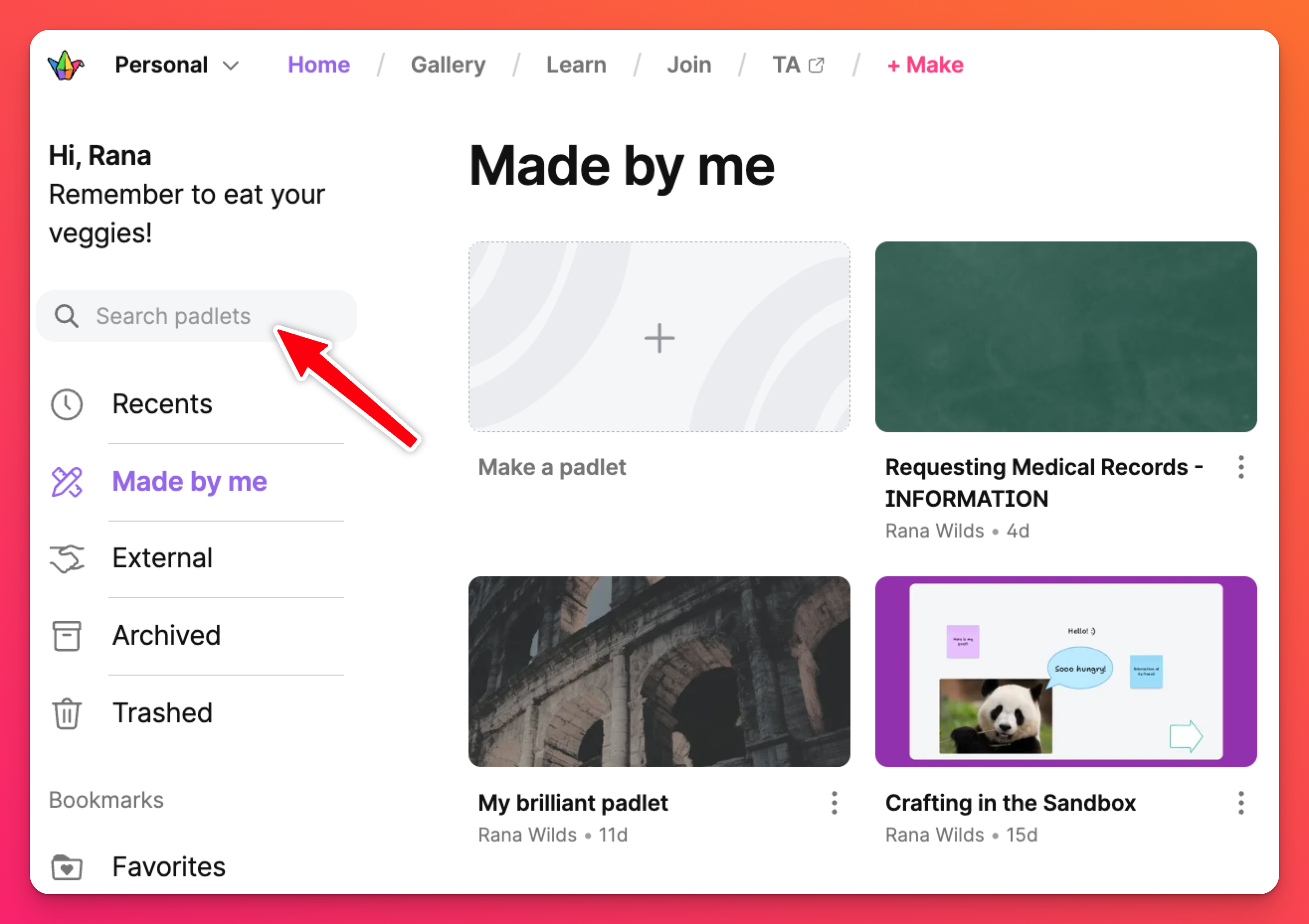 Готови ли сте да създадете свой собствен падлет? Щракнете върху бутона + Направи, за да започнете! Създайте палет от нулата, използвайте Sandbox за създаване на интерактивни игри и бели дъски, Създайте с AI или изберете един от нашите Шаблони (известни също като Рецепти).