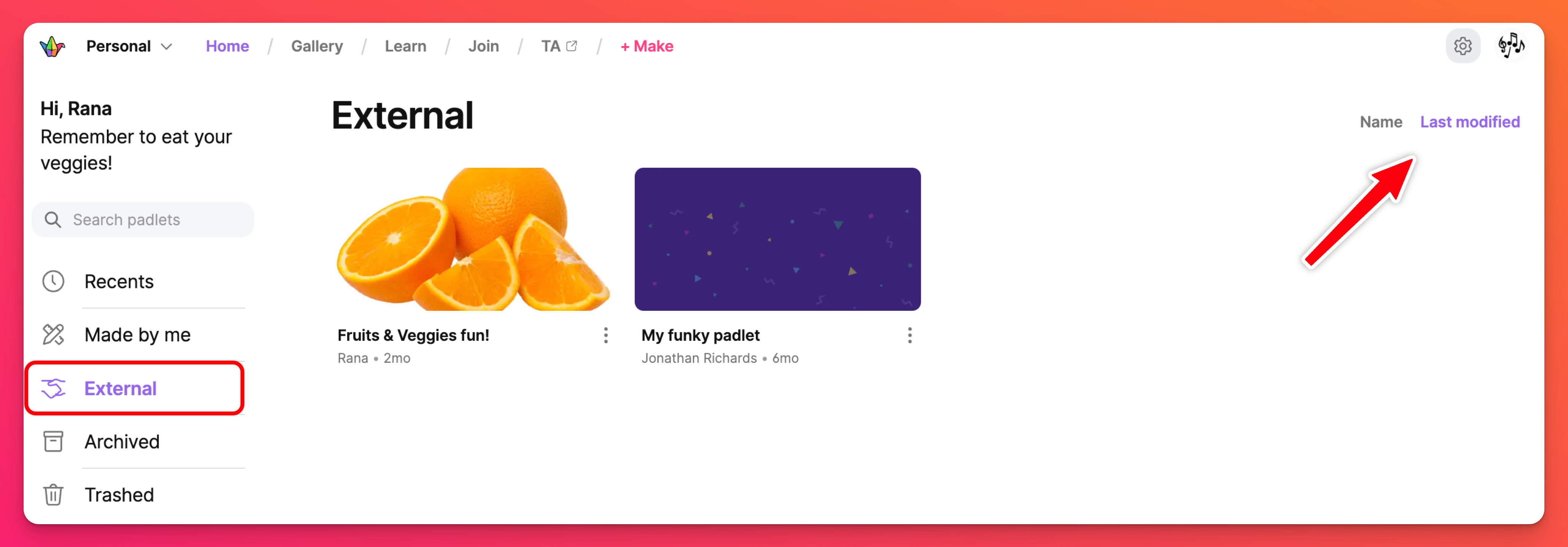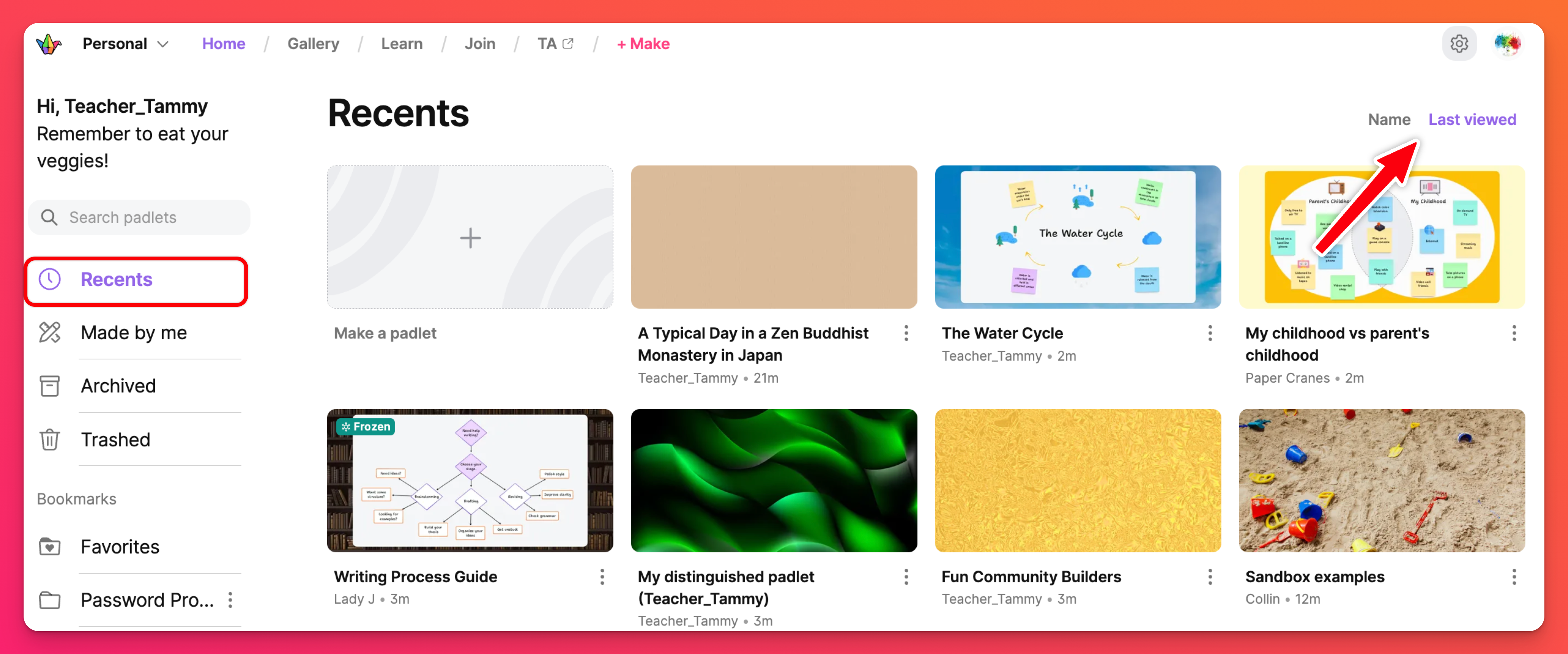 Папката Recents съдържа всеки Padlet, който сте посетили през последните 30 дни.
