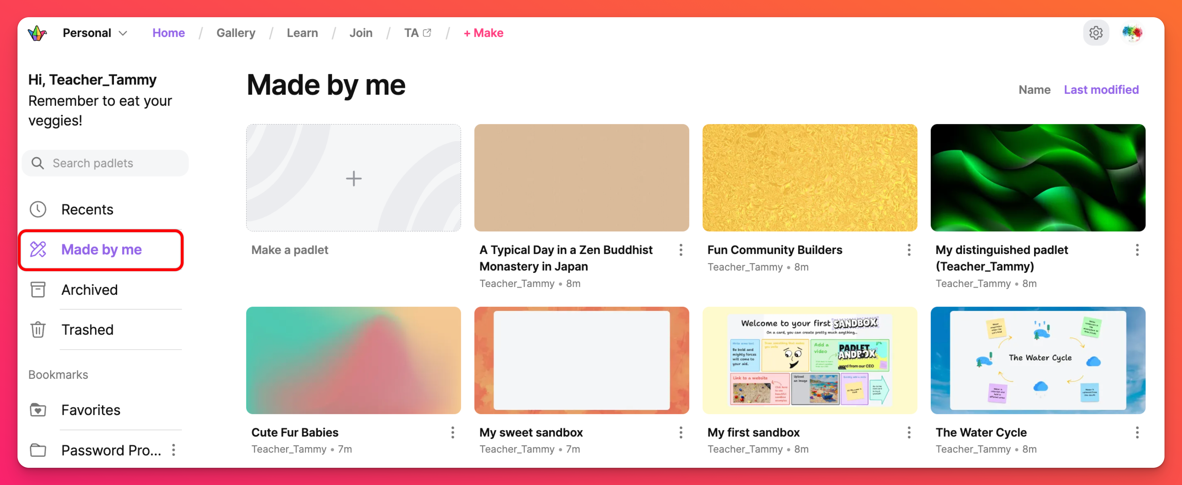 Папката Made by me (Направено от мен) съдържа само падлети, създадени от вас!