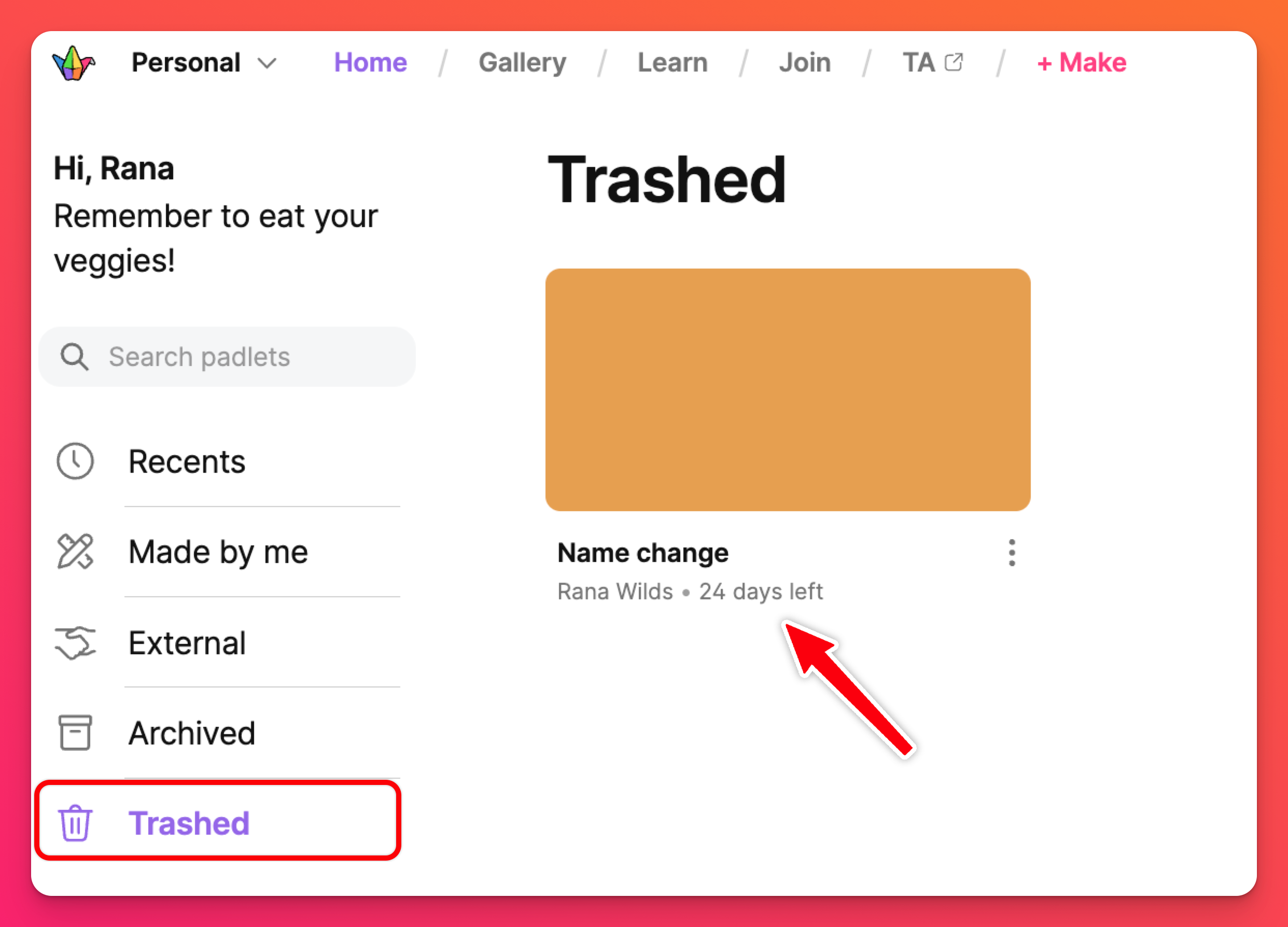 Папката Trashed (Изхвърлени) съдържа падлети, които сте изтрили. Непосредствено под заглавието на падлета можете да видите датата. Това ви показва колко дни ви остават, преди падежите да бъдат окончателно изчистени от нашата база данни и да не могат повече да бъдат възстановени.