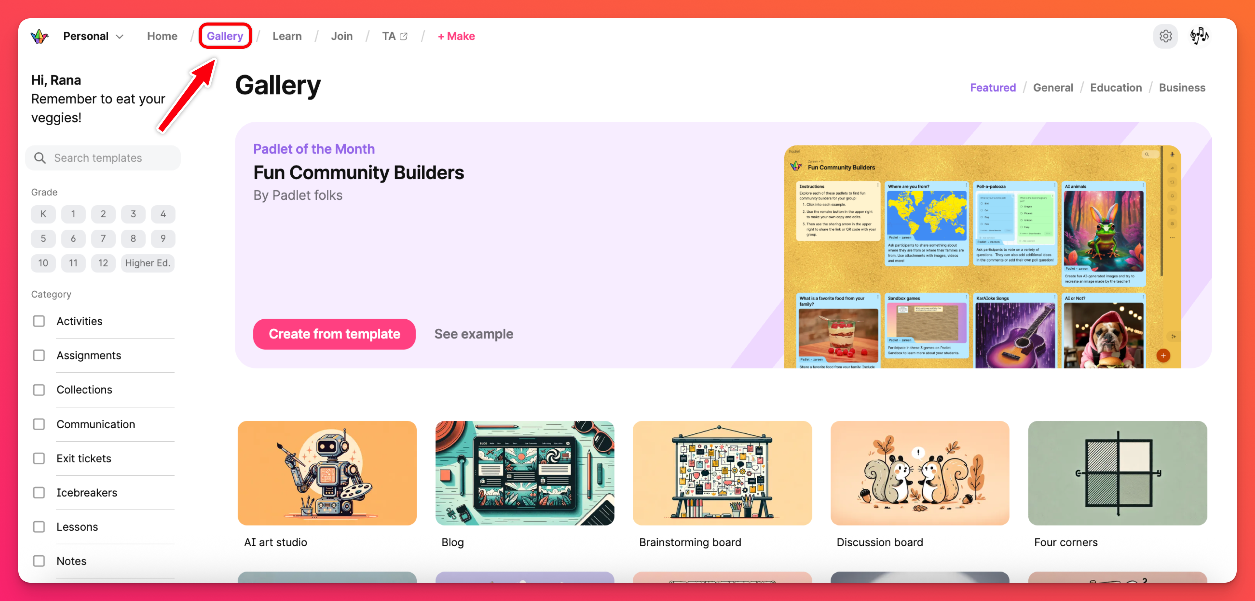 Имате нужда от вдъхновение за следващия си Padlet? Не търсете повече от галерията! В Галерията можете да намерите примери, в които са използвани нашите готови шаблони! Щракнете върху бутона " Галерия", показан по-долу, и вижте над 200 Шаблона в галерията, подредени по категории (Препоръчани/Общо/Училище/Бизнес).