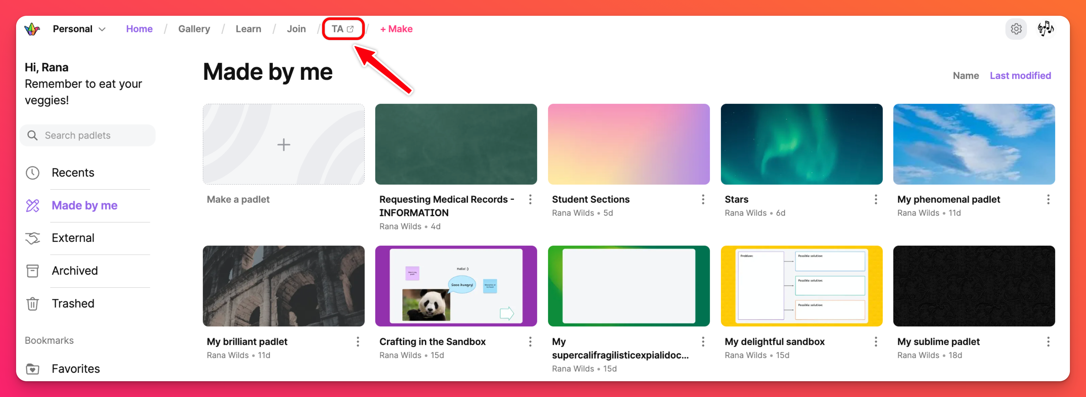 Padlet TA е нашият асистент за преподаване с изкуствен интелект, предназначен за образователна употреба. Той се използва, за да помогне на учителите да се съсредоточат повече върху преподаването и по-малко върху подготовката и административните задачи. Щракнете върху бутона TA в горната част, за да стигнете до него директно от таблото си за управление, или отидете на ta.padlet.com.