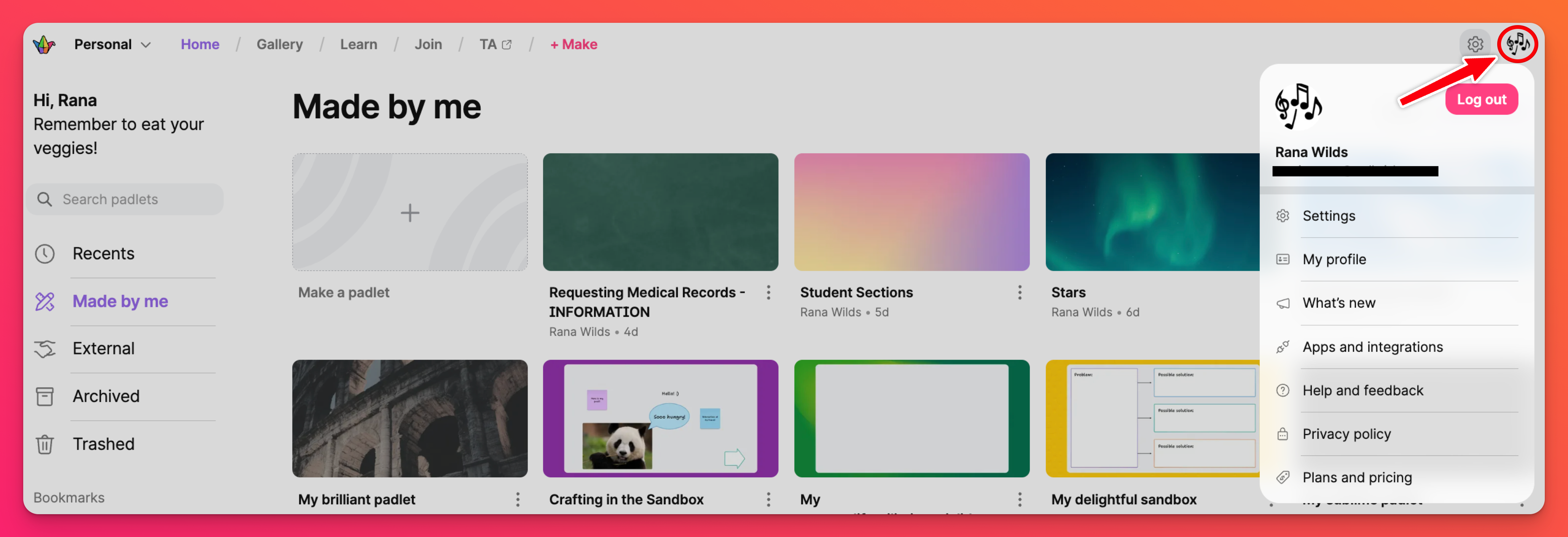 Получете достъп до потребителското меню, като щракнете върху аватара си в горния десен ъгъл на таблото за управление. Използвайте това меню, за да излезете от Padlet, да получите достъп до настройките на профила си и да потърсите помощ.