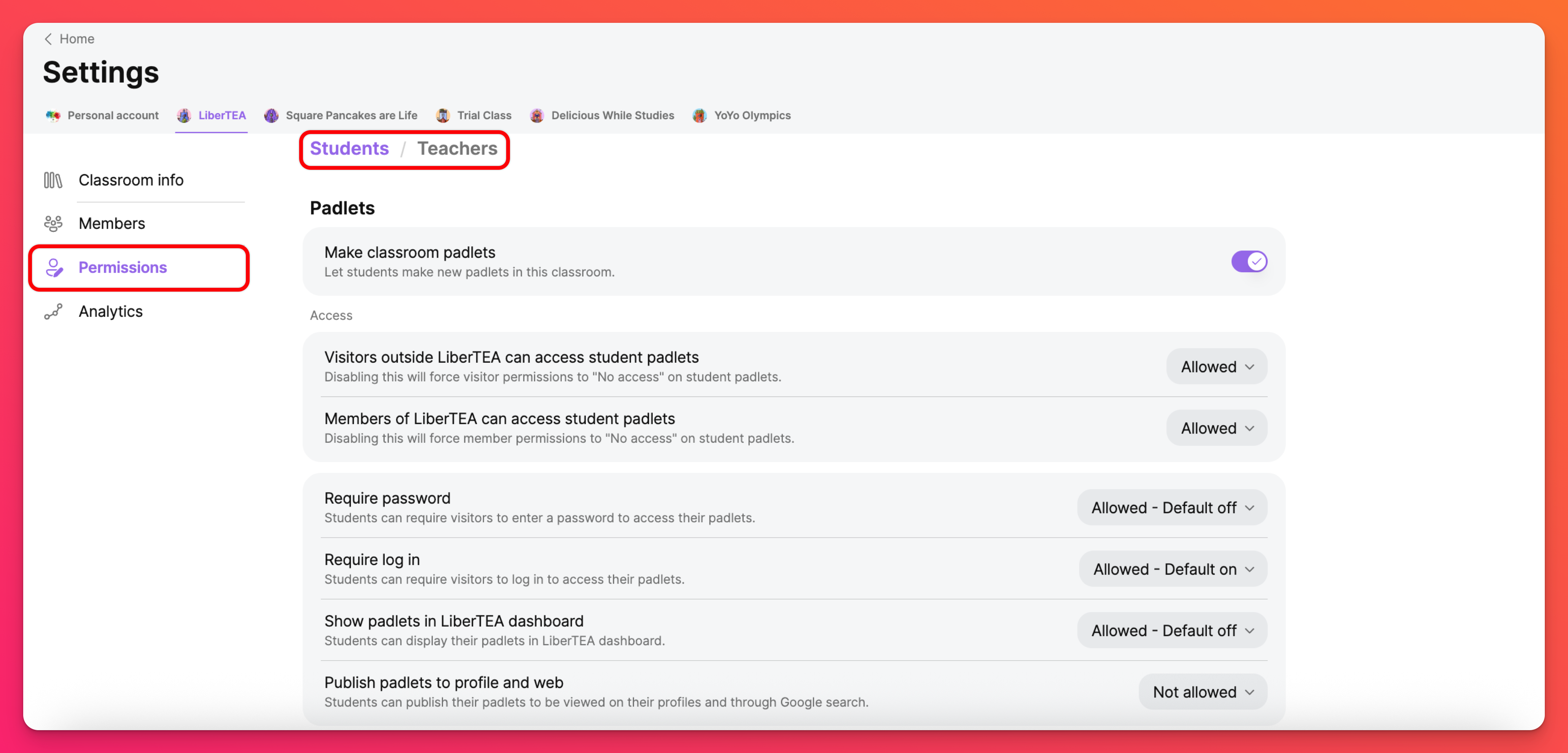 Giv dine lærere og elever tilpassede indstillinger ved at klikke på Tilladelser. Skift mellem Elever og Lærere øverst på siden for at vælge forskellige tilladelser for hver rolle.