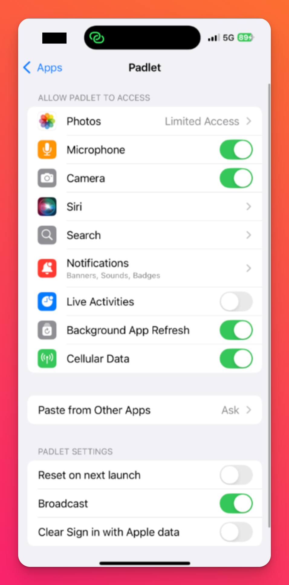 Ομοίως, οι περισσότερες συσκευές διαθέτουν ρυθμίσεις δικαιωμάτων που βρίσκονται στις ρυθμίσεις τους. Τα δικαιώματα υποδηλώνονται συνήθως από ένα εικονίδιο γραναζιού (⚙️). Μπορείτε να αποφασίσετε ποια δικαιώματα θα δώσετε στην εφαρμογή Padlet στις ρυθμίσεις σας.