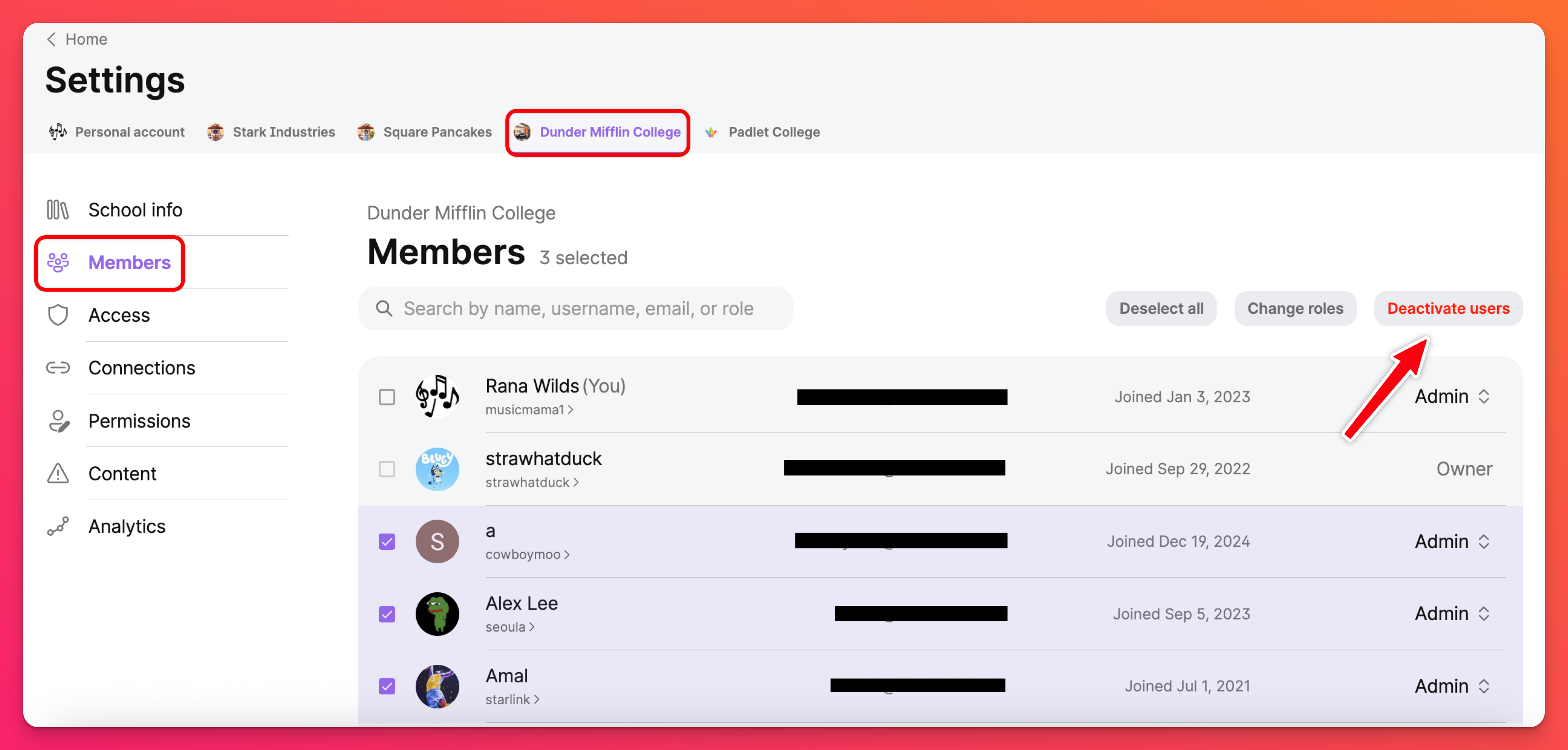 Η απενεργοποίηση των μελών θα τους στερήσει την πρόσβαση στο λογαριασμό, αλλά τα padlets τους θα εξακολουθούν να είναι προσβάσιμα από τον οργανισμό.