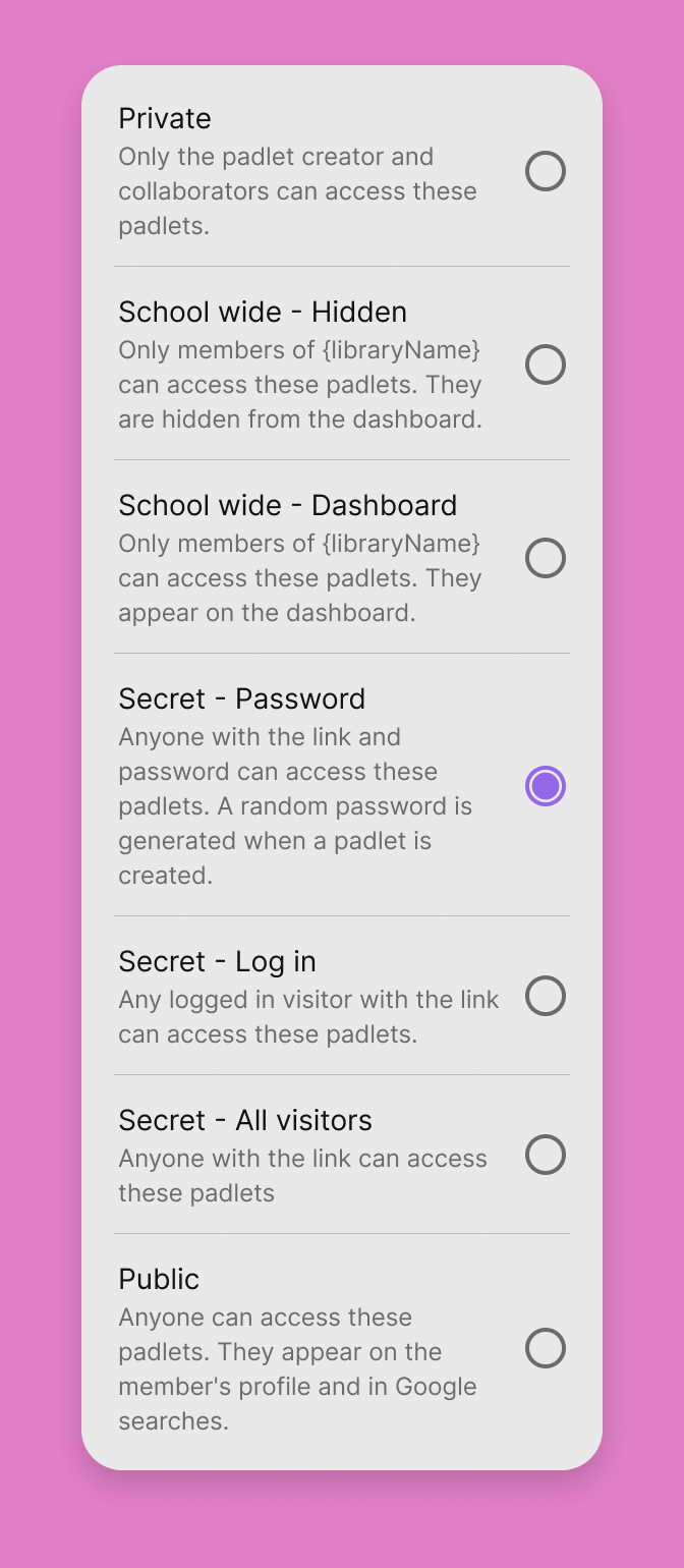On October 23, 2025 we made some changes to privacy options for boards and sandboxes in Padlet. These changes give greater control over who can access your padlets while being more intuitive to use. When we migrate the old privacy options to the new ones, there will be no changes to who can access your padlets.