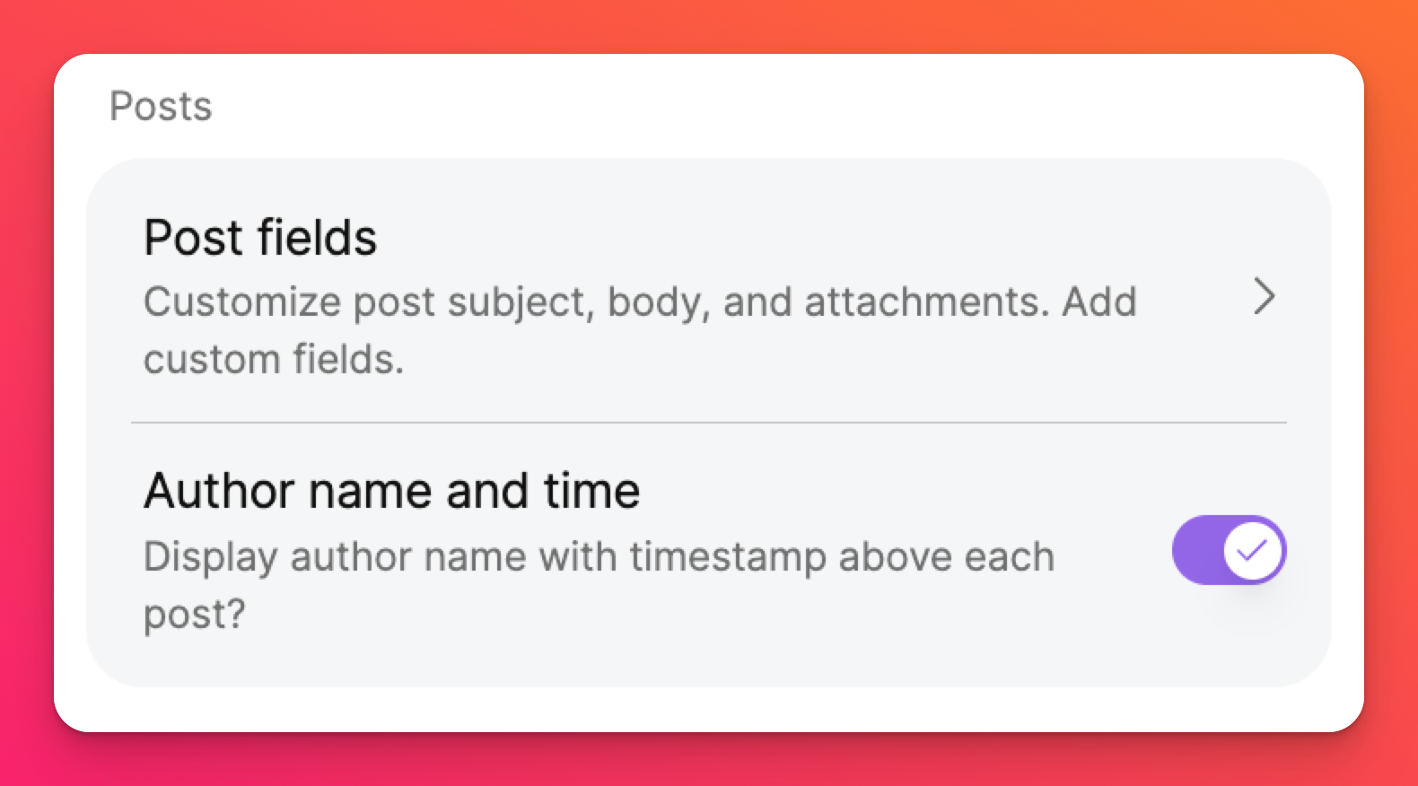 - Under Posts, toggle the button ON next to 'Author name and time.'