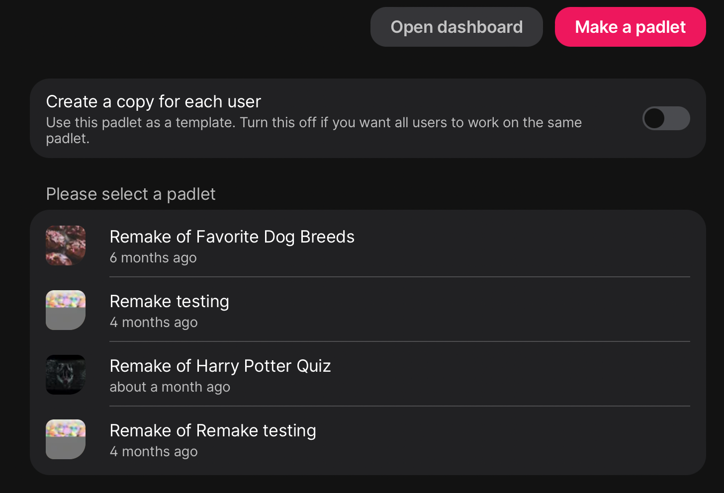 If you want students to work on their own copy of the padlet, toggle the 'Createa copyforeachuser' to the ON position. Students will get their own copy when they click on the link in the assignment and you will be automatically added as a shared member to the padlet.