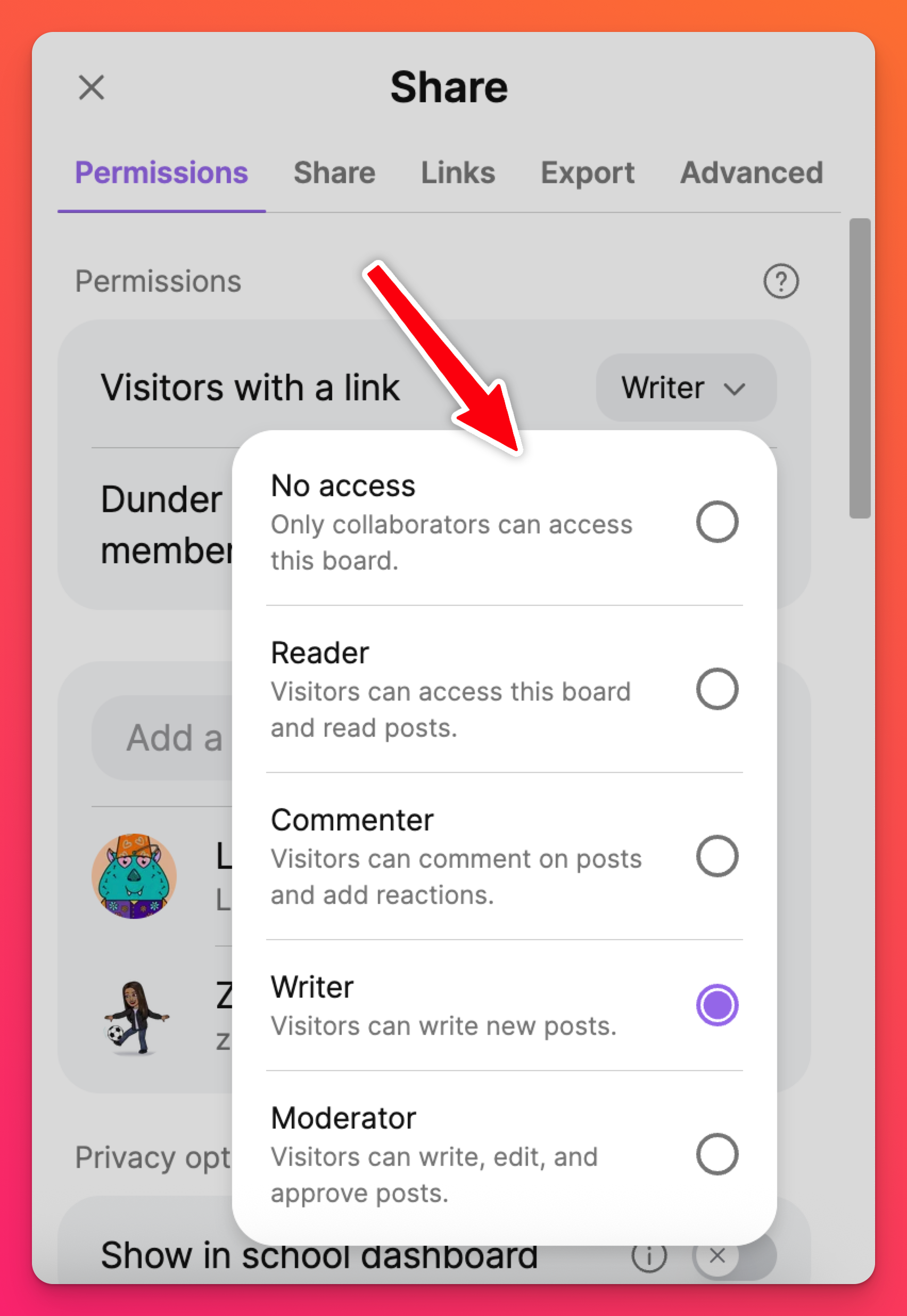 Jos sinulla on Padlet for Schools -tili osoitteessa padlet.com ja haluat jakaa padletin saumattomasti jonkun muun kuin jäsenen kanssa, voit ensimmäisenä askeleena tehdä padletin asetuksiin muutoksia, joilla sallitaan pääsy.