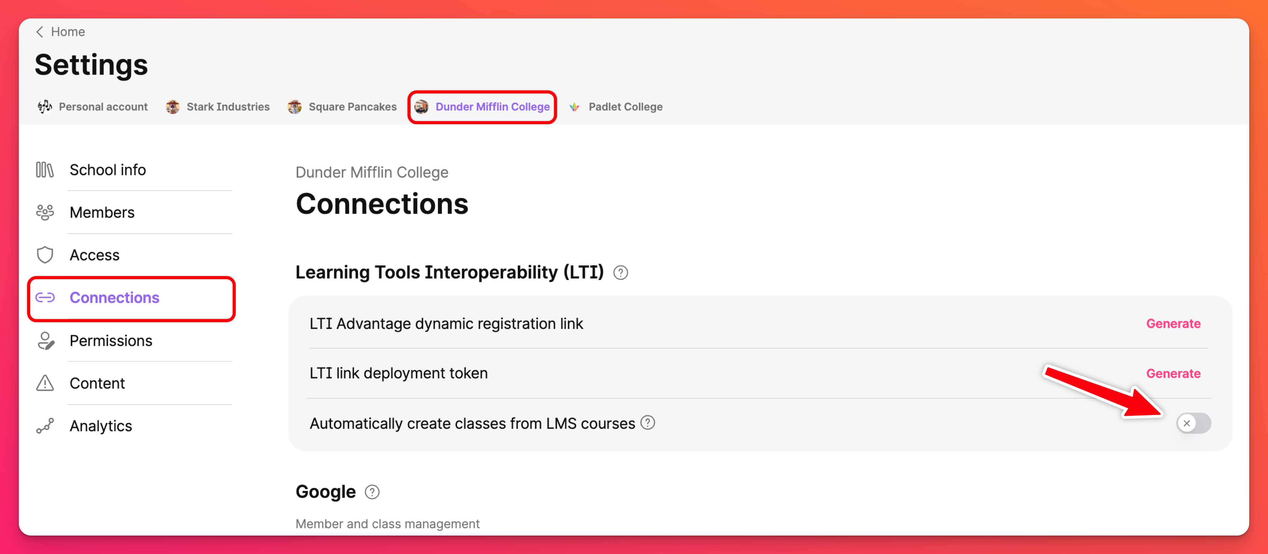 - Jos sinulla on Padlet for Schools -tili osoitteessa padlet.com, sinun on otettava käyttöön "Luo automaattisesti käyttäjäryhmiä LMS-kursseista " -vaihtoehto Connections-sivulla.