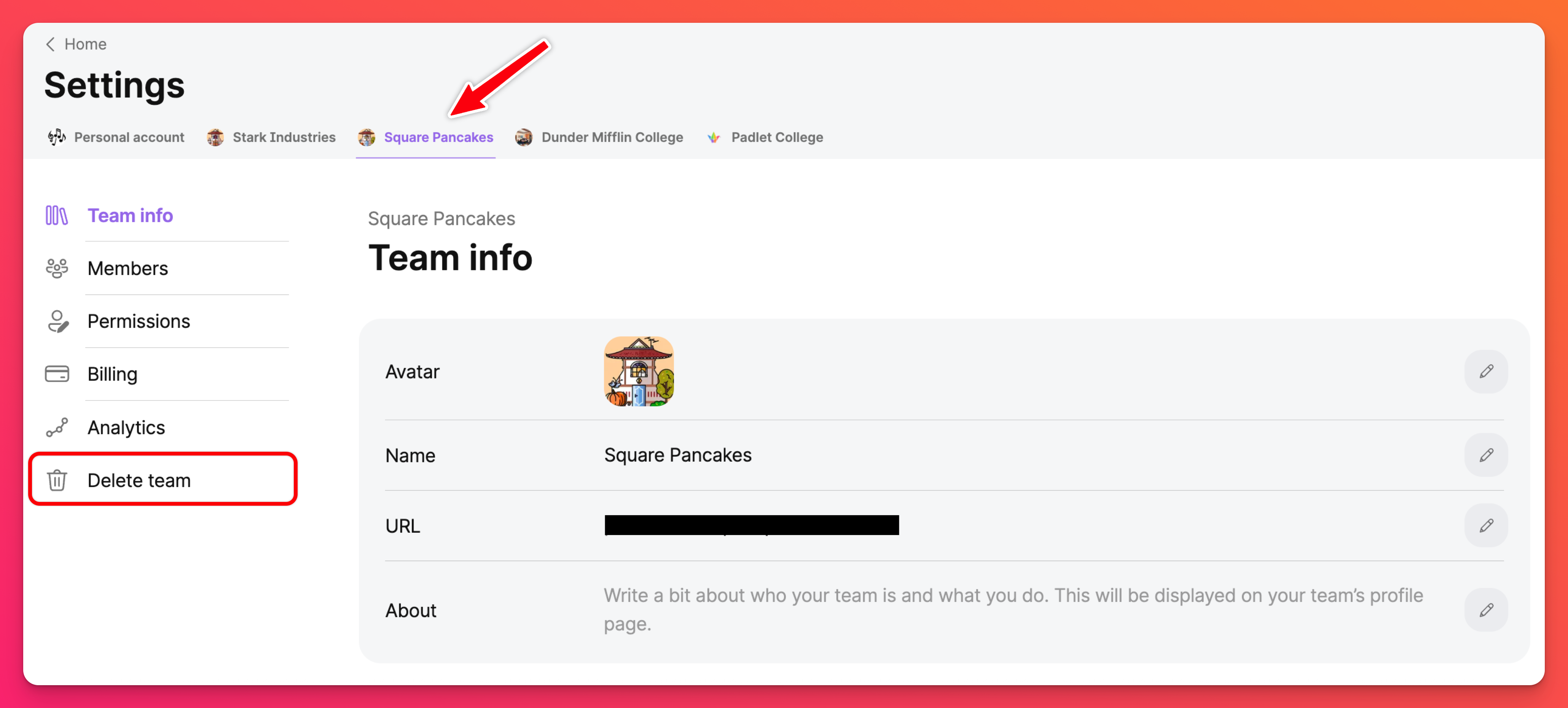 - Ensuite, entrez un nom et une URL pour votre équipe. Vous pouvez choisir votre propre nom ou vous en tenir à celui fourni par Padlet.