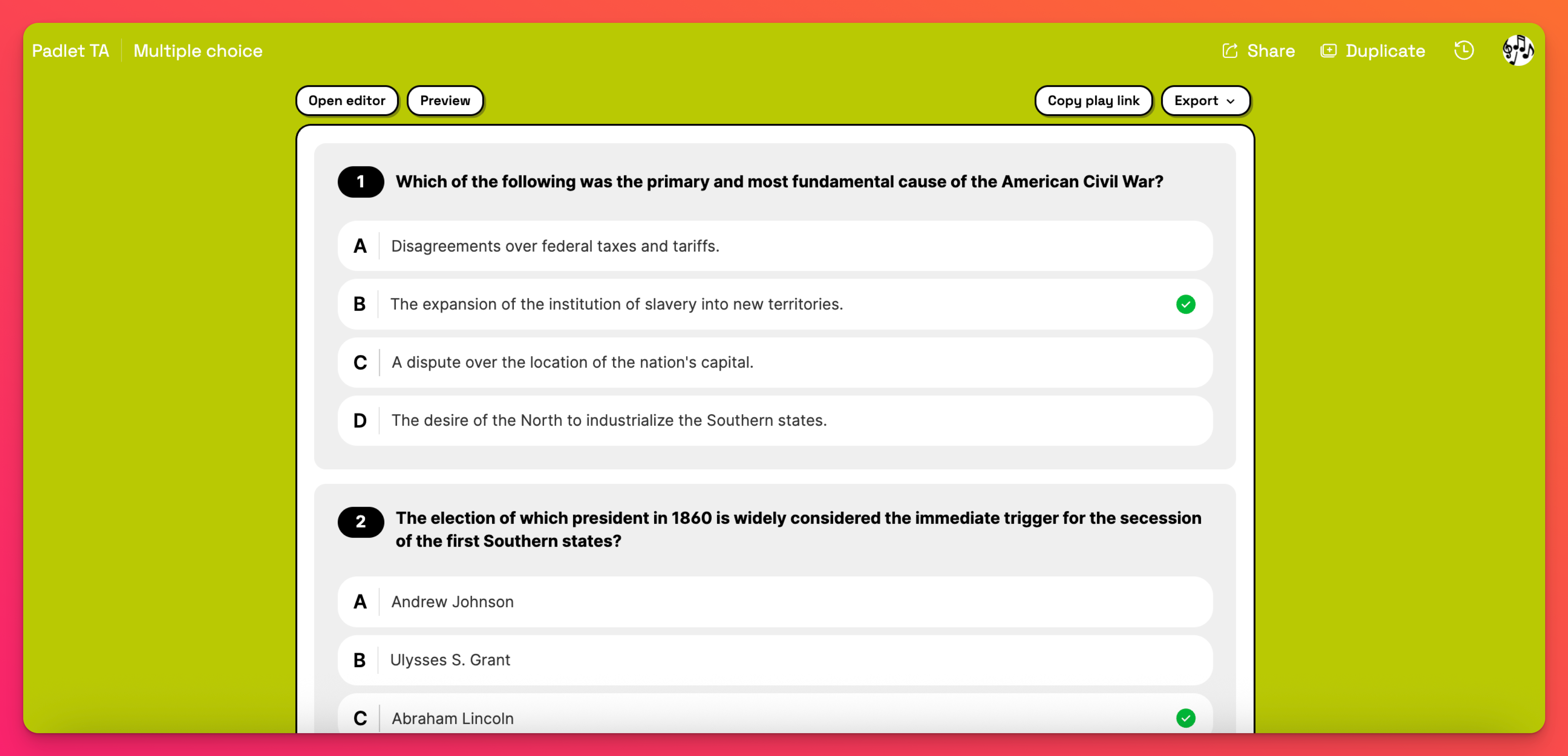 Padlet TA est notre assistant pédagogique doté d'une intelligence artificielle qui vous aide à créer des supports pédagogiques attrayants et amusants. Il est disponible dès maintenant sur ta.padlet.com.