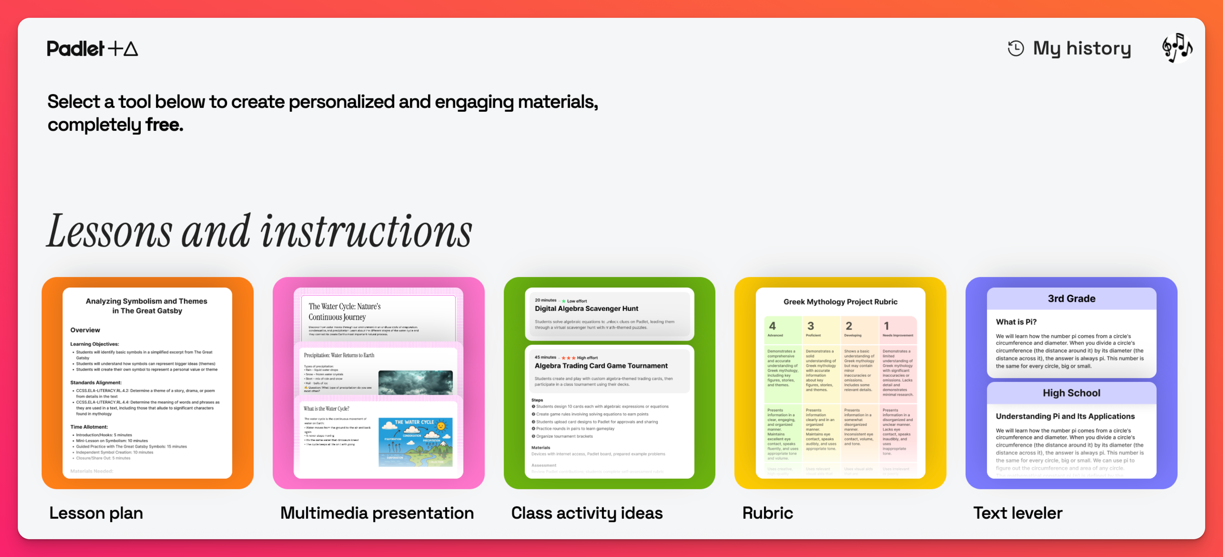 Choisis un outil dans le tableau de bord pour créer des quantités infinies d'activités d'apprentissage créatives et amusantes ! Chaque outil comporte une série d'invites. Il vous suffit de remplir les questions, d'ajouter tout média extérieur que vous souhaitez inclure (facultatif) et de cliquer sur la flèche pour générer vos résultats.