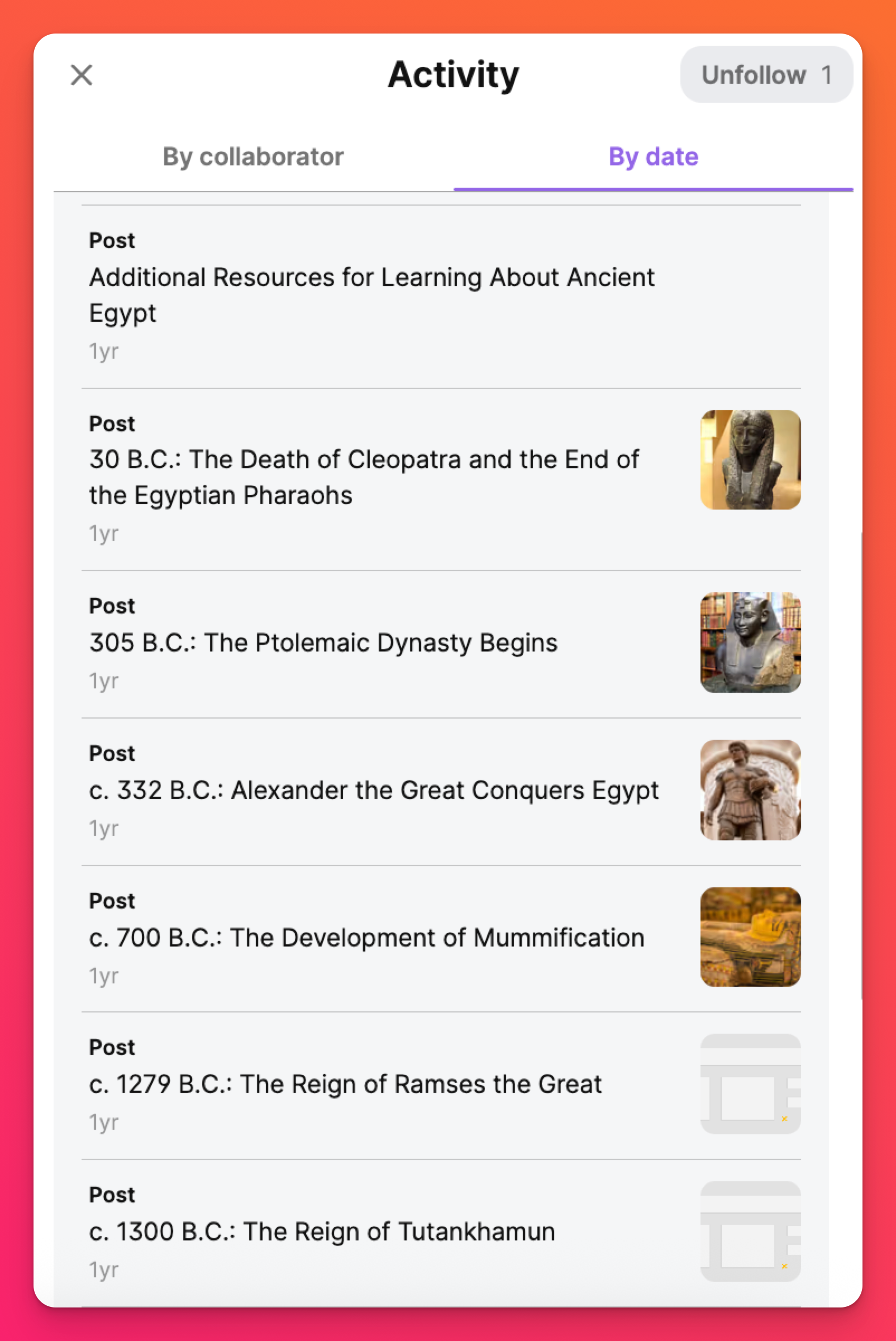 Le panneau Activité (🔔) affiche un flux de toutes les publications sur un padlet par ordre chronologique. Vous pouvez également utiliser le panneau Activité pour suivre/ne plus suivre un padlet.