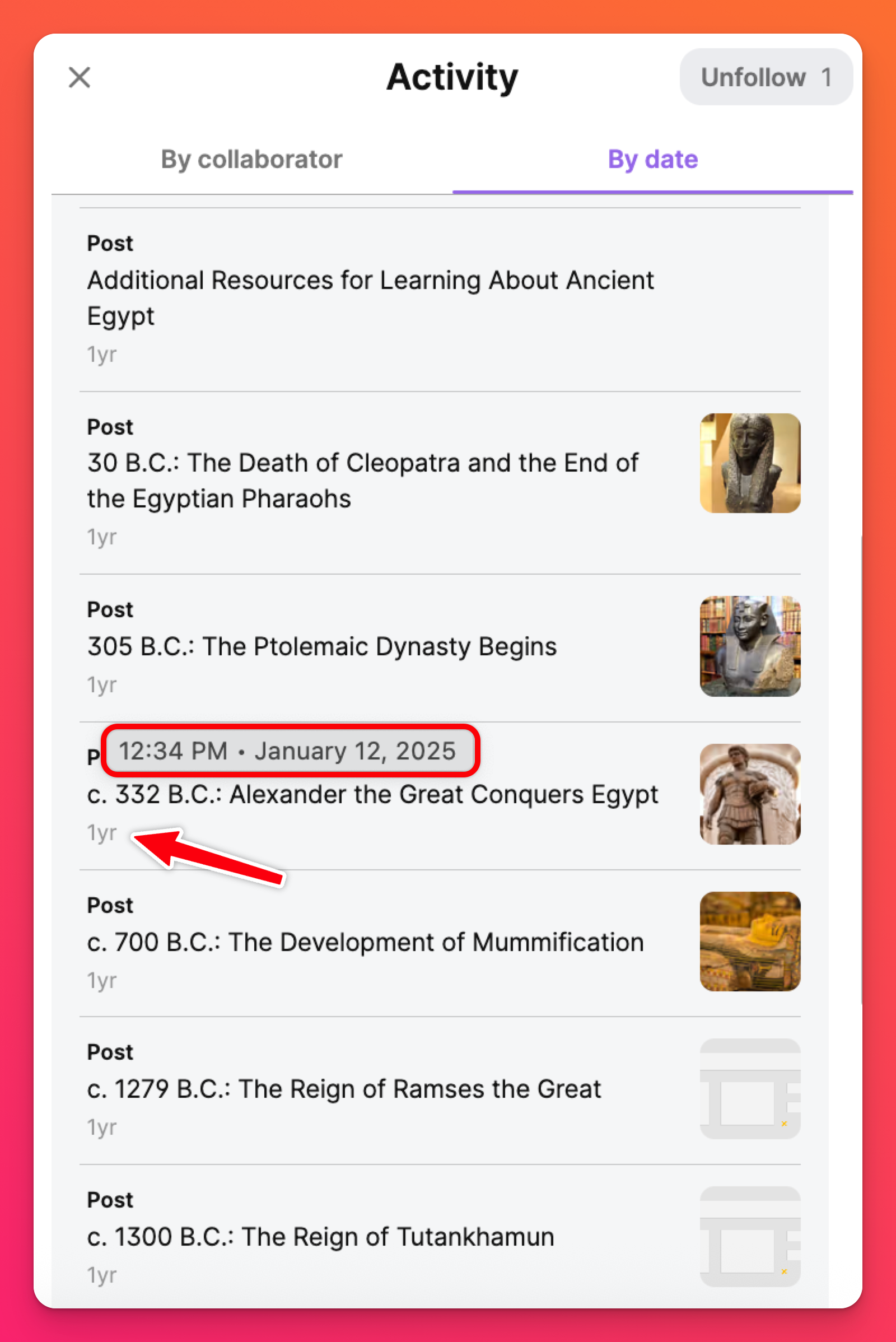 Sous le bouton Suivre, vous verrez un flux d'activité. Cliquez sur l'une des mises à jour pour ouvrir la publication en vue agrandie. Vous pouvez également passer la souris sur l'horodatage pour voir un horodatage agrandi avec la date et l'heure auxquelles la publication a été ajoutée.