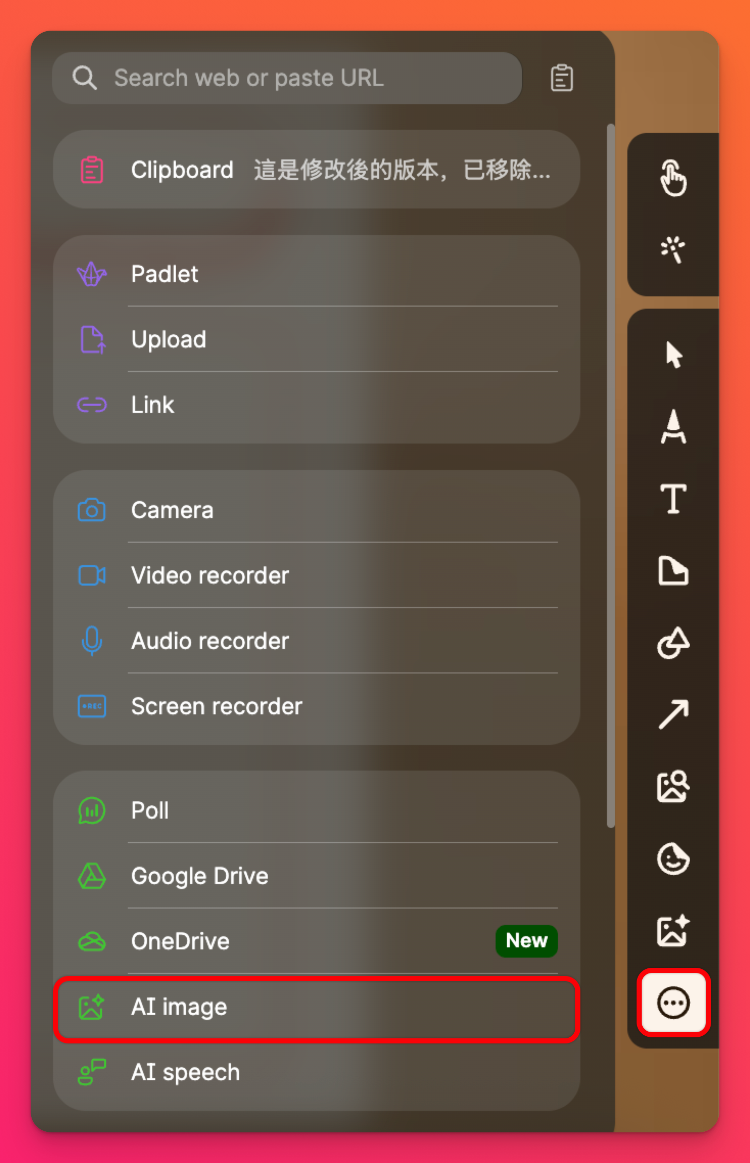 Pour accéder à la fonctionnalité d'image IA dans Sandbox, cliquez sur le bouton à trois points (...) dans le menu des outils, puis sélectionnez Image IA.