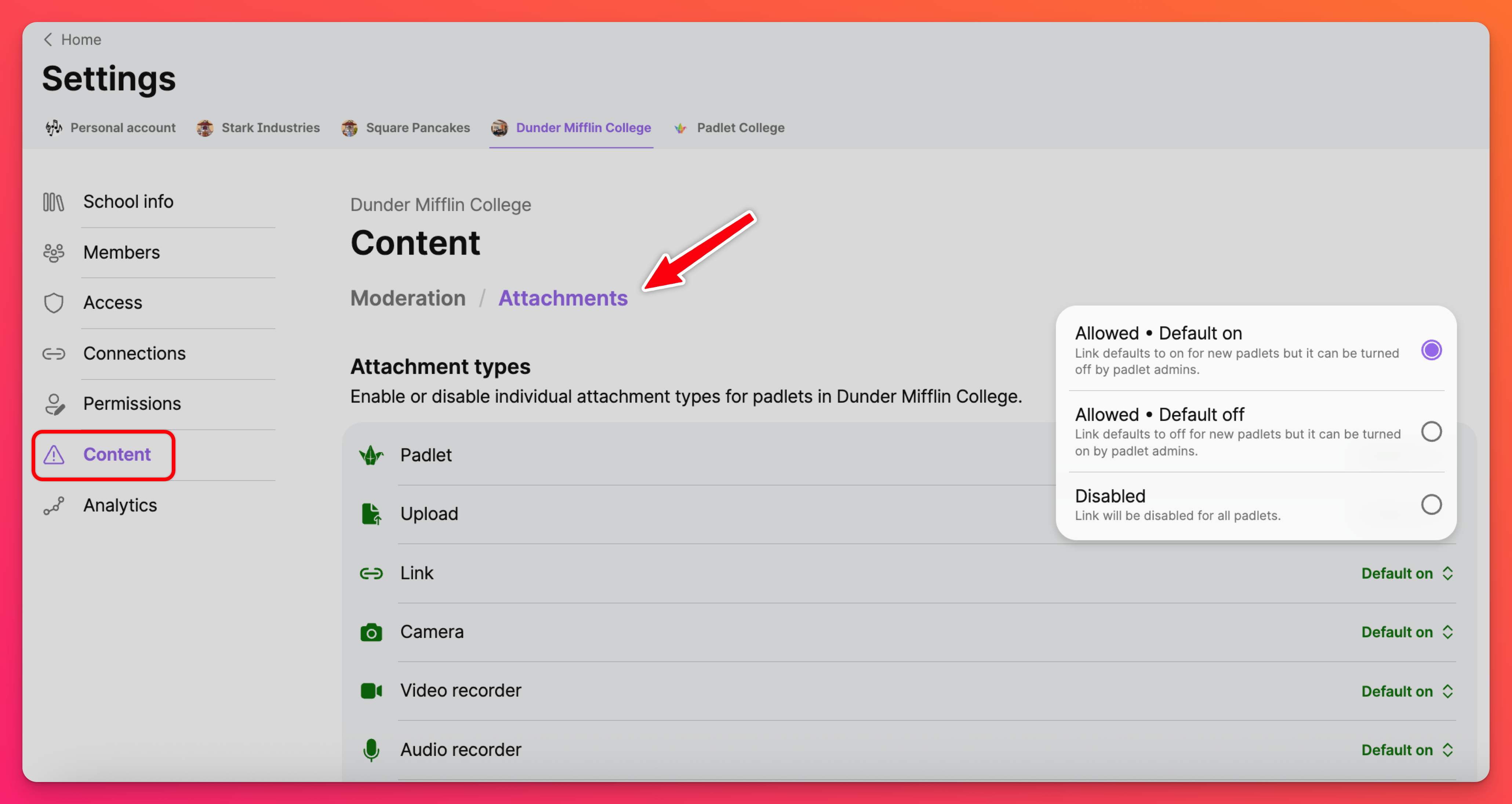 Ha Ön a tulajdonos (vagy valaki, aki adminisztrátori jogosultságokkal rendelkezik) egy Classroom vagy Padlet for Schools fiókban (a padlet.com oldalon), akkor a fiók beállításain belül letilthatja a csatolmánytípusokat. Csak menjen a Beállítások menüpontba > kattintson a megfelelő fiókra > kattintson a Tartalom menüpontra > a tetején válassza a Mellékletek menüpontot > kattintson a melléklet típusa melletti legördülő menüre > válassza a Letiltva lehetőséget.