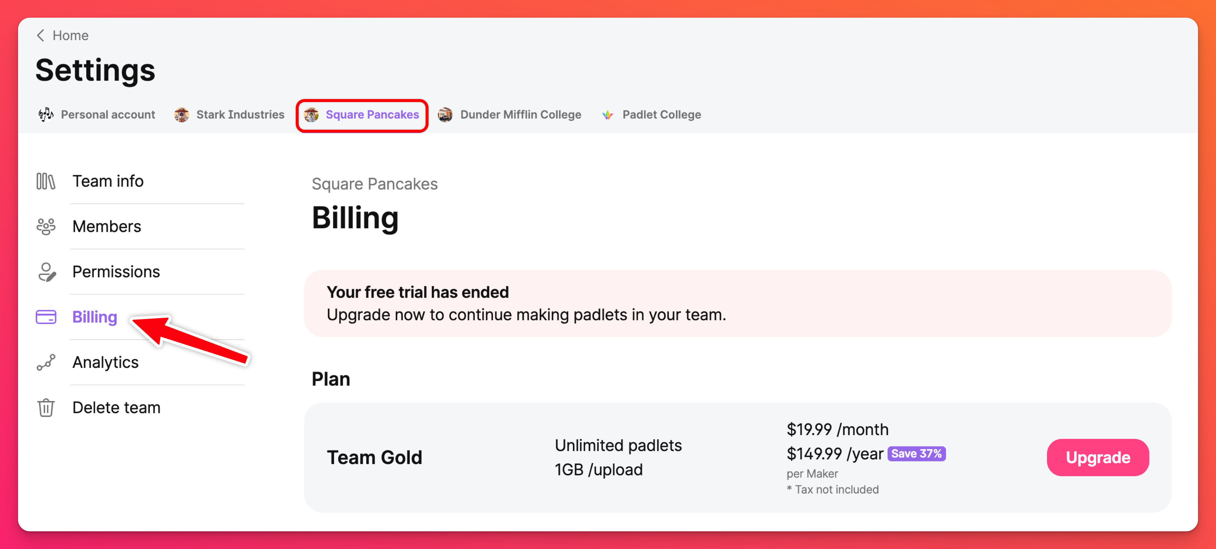 Untuk meningkatkan paket Anda ke akun Team Gold, Kelas, atau Padlet untuk Sekolah - pilih salah satu dari yang berikut ini: