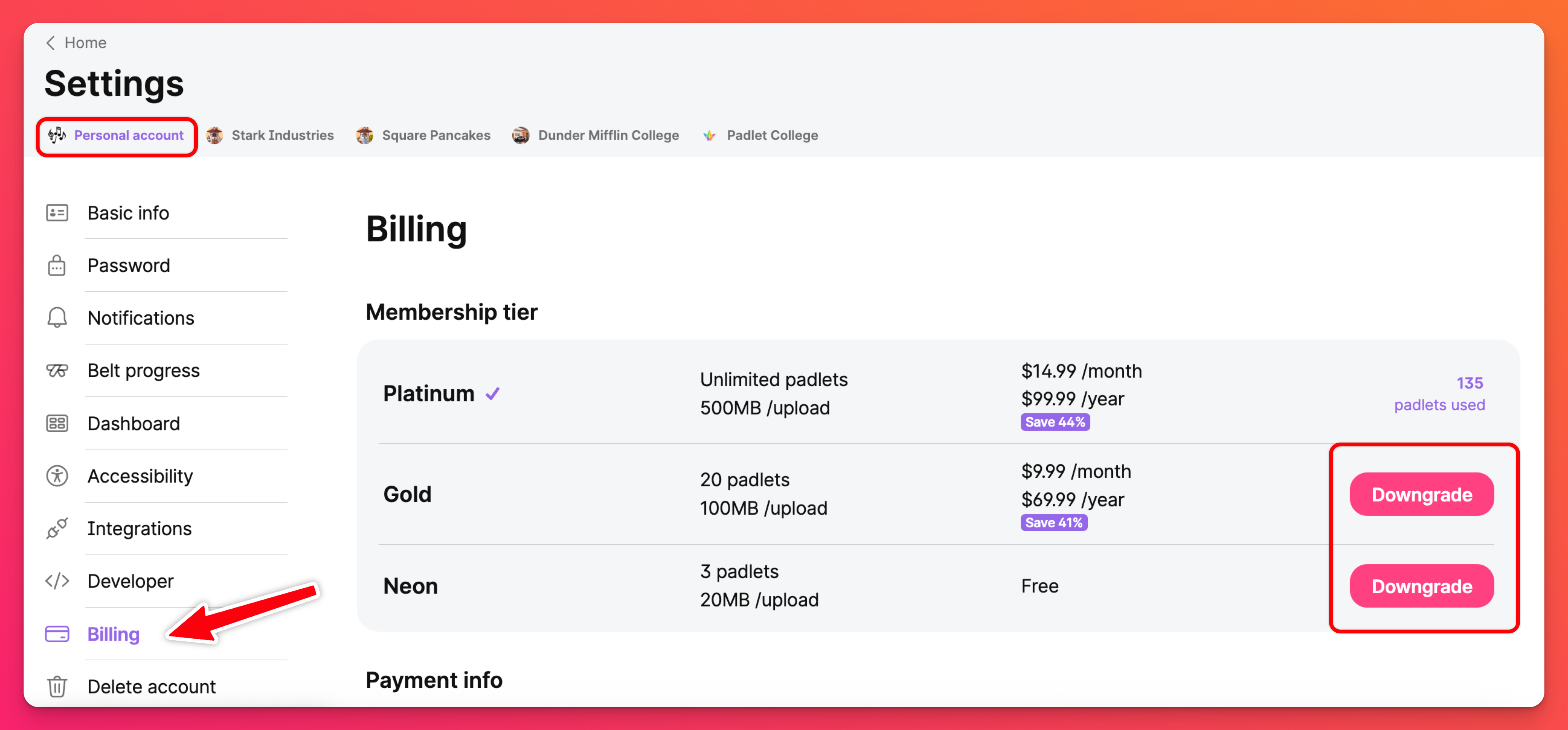 Jika tombol Downgrade berwarna abu-abu, ini karena Anda berada di luar jendela pengembalian dana. Silakan hubungi dukungan Padlet dan kami akan membantu Anda!