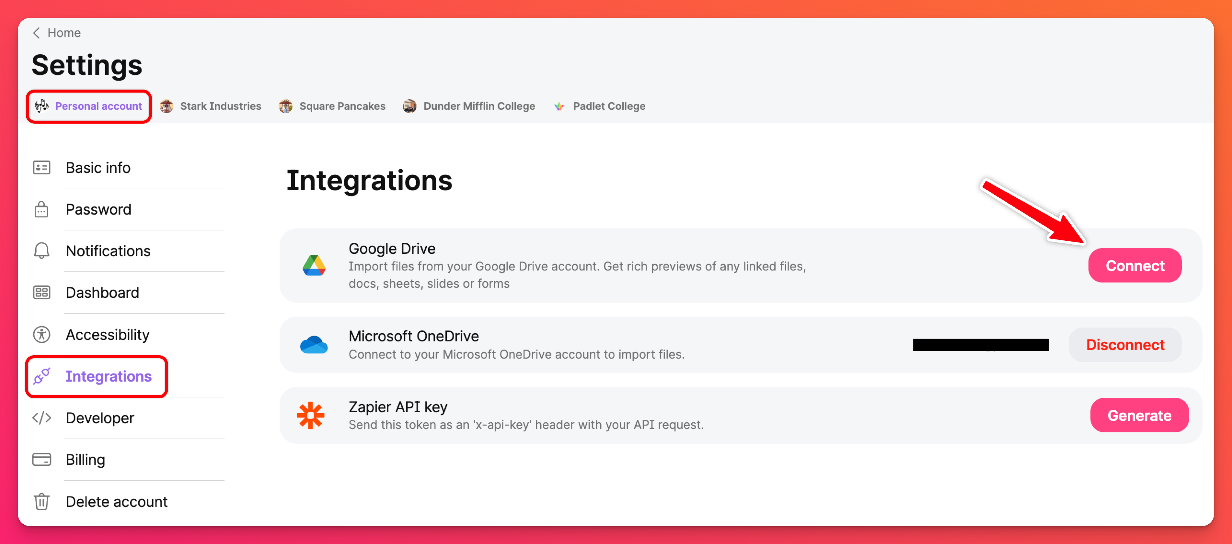 Se non avete ancora impostato l'integrazione tra Google Drive e Padlet, potete farlo nelle vostre Impostazioni alla voce Integrazioni. Per vedere una guida passo passo, cliccate qui.