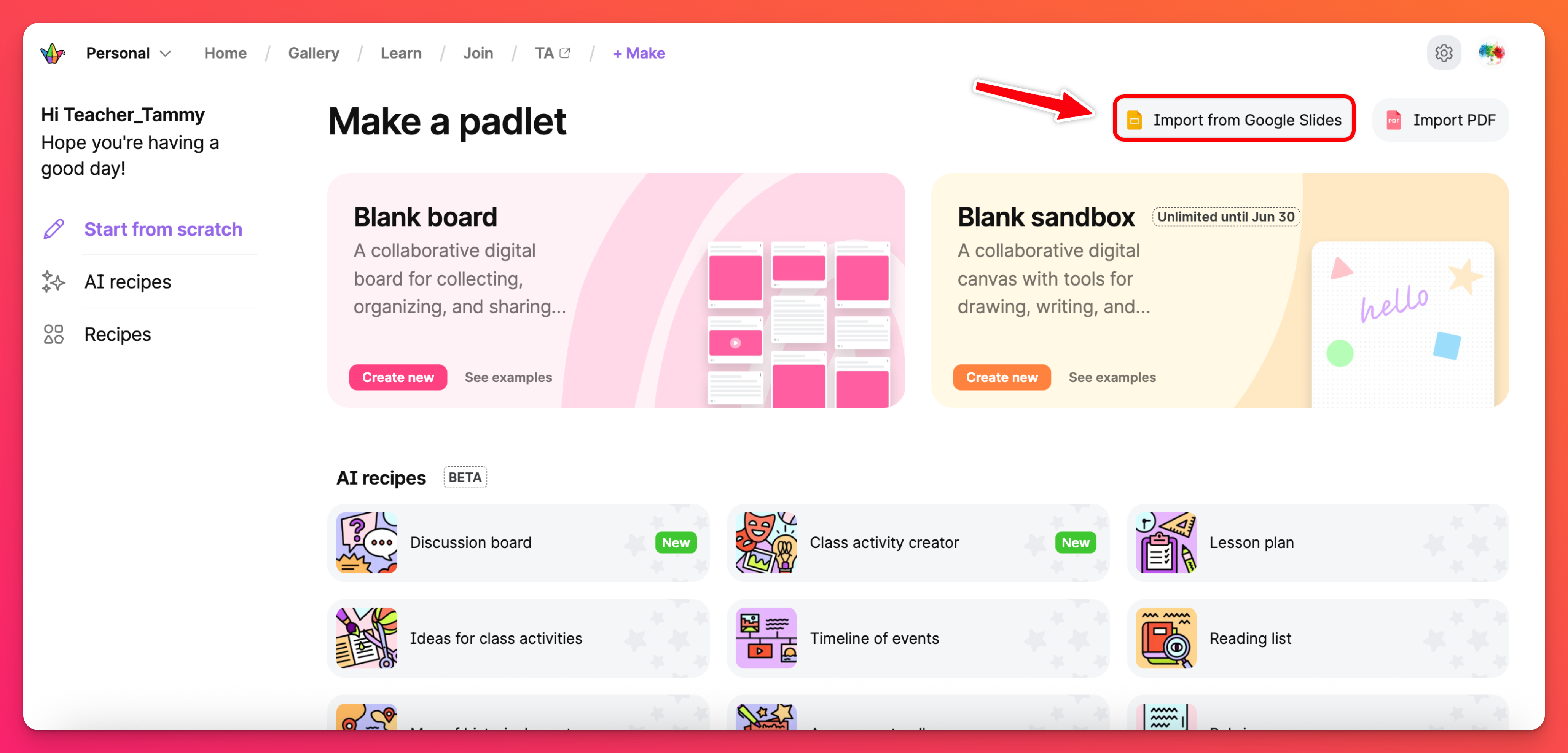 Convertire Google Slides in una Sandbox è semplice! Tutto quello che dovete fare è collegare Padlet al vostro account Google Drive e caricare il contenuto!