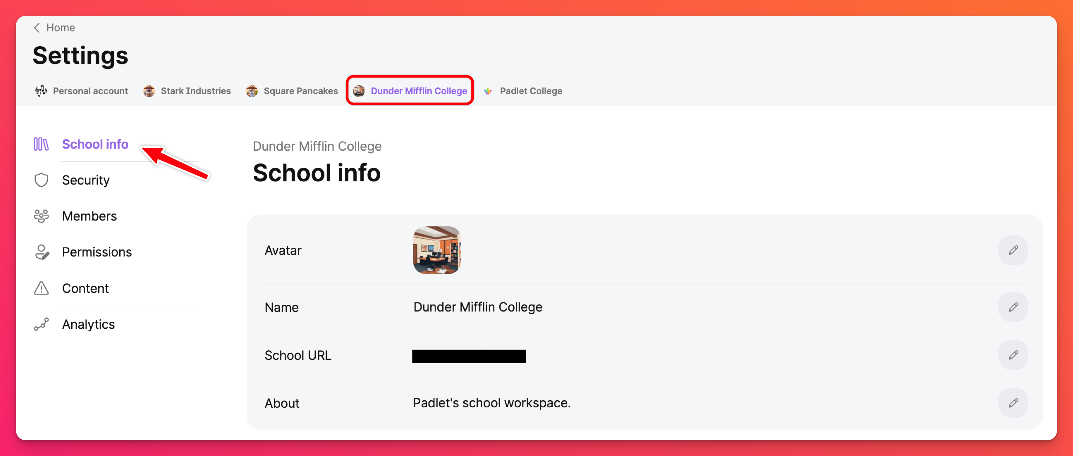 Nel pannello a sinistra della pagina delle impostazioni, fare clic su Informazioni sulla scuola. Qui è possibile modificare il proprio avatar/logo, il nome del proprio account e il connettore LTI (se si desidera utilizzarne uno).