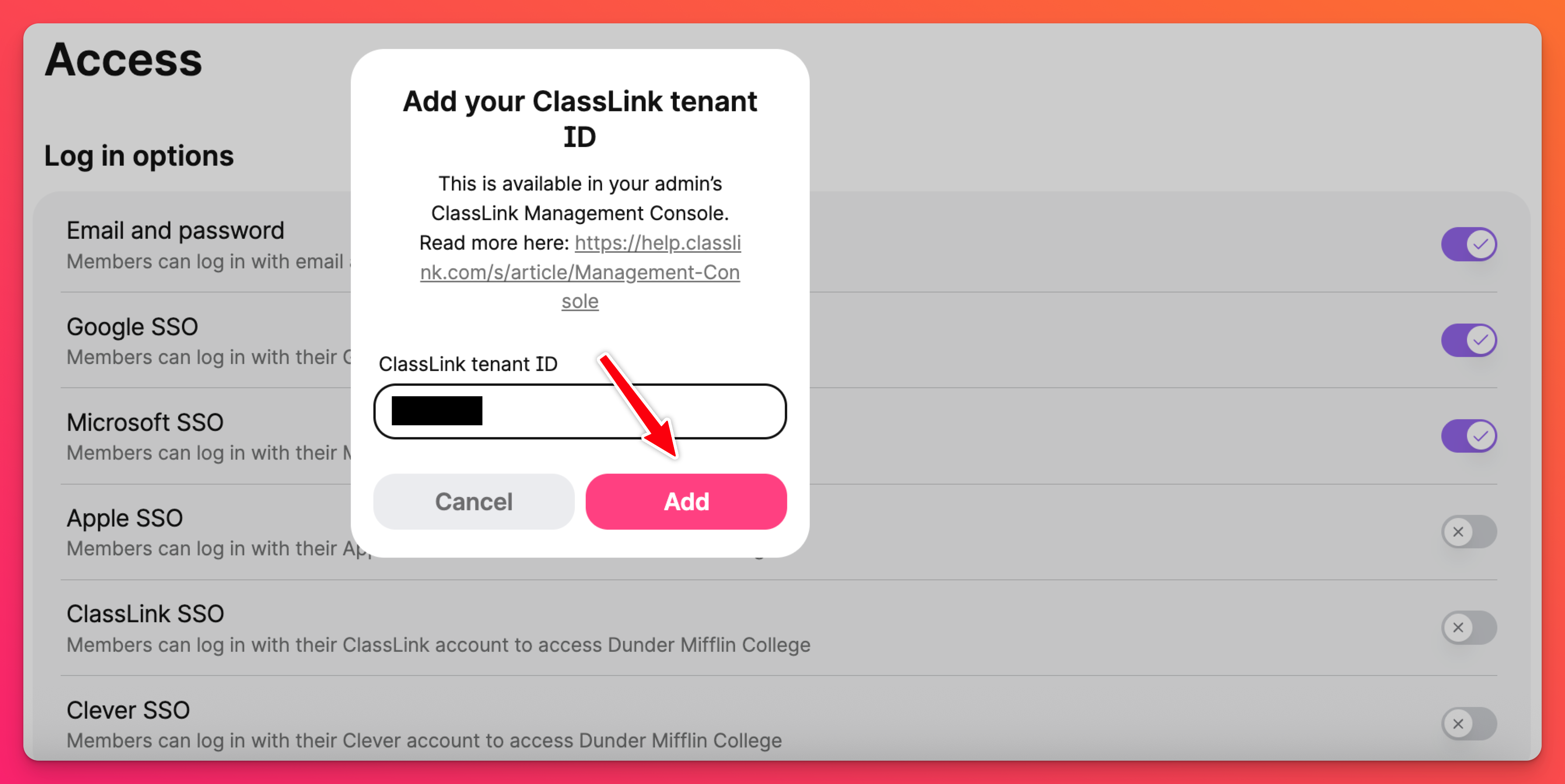 - 토글이 켜짐으로 설정되면 ClassLink 테넌트 ID를 입력한 다음 추가를 클릭해야 합니다. 이렇게 하면 학생들은 첫날부터 추가 작업 없이도 학교용 패드렛 도메인을 방문하여 ClassLink 계정을 통해 로그인할 수 있습니다.