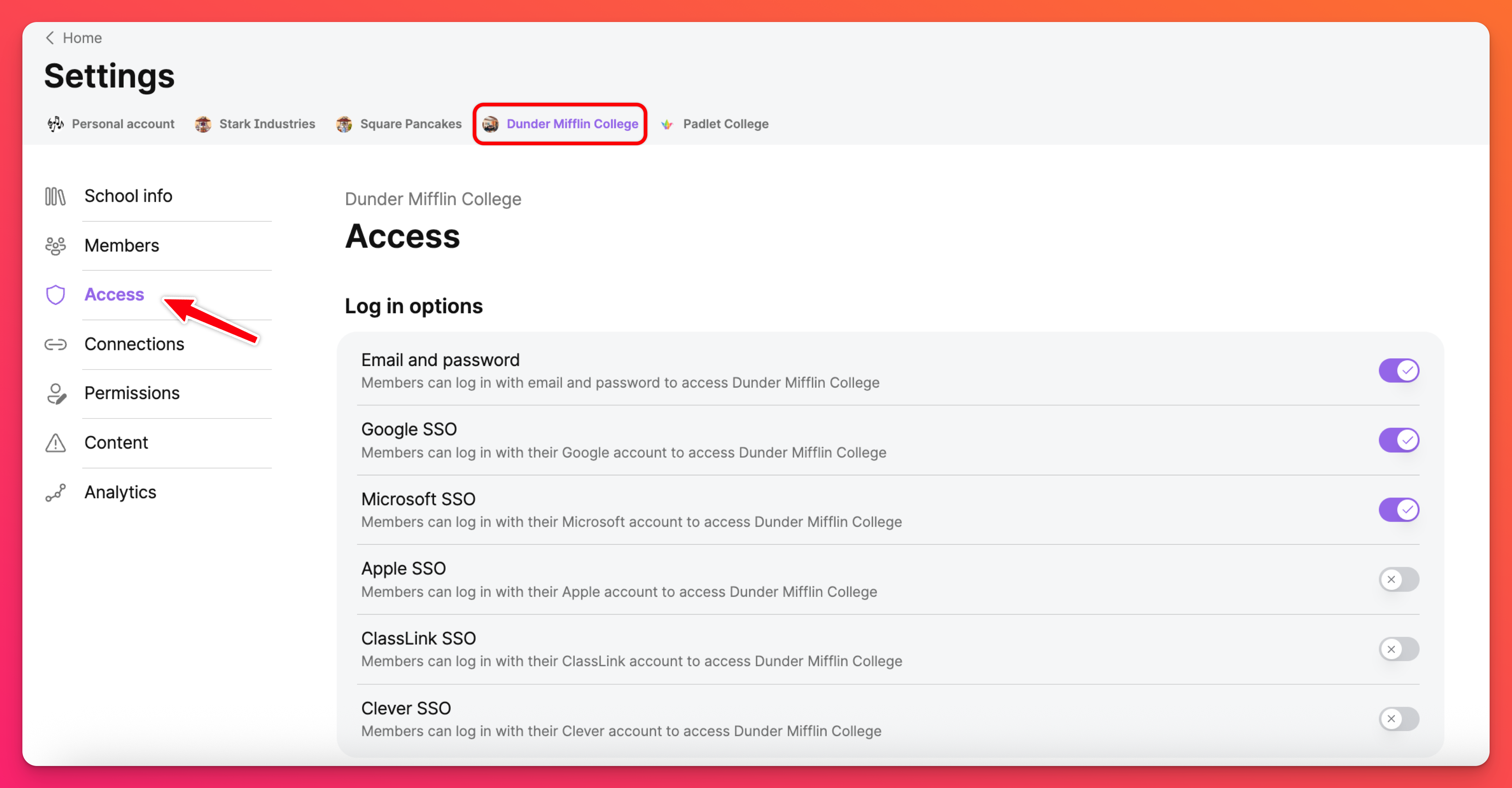 타사 로그인, 즉 통합 인증 (SSO)을 활성화하면 계정에 대한 액세스 권한을 안전하고 간편하게 부여할 수 있습니다. 학교용 패드렛에서 타사 로그인을 사용 설정하면 Google, Microsoft 또는 ClassLink에서 기존 자격 증명을 사용할 수 있습니다.