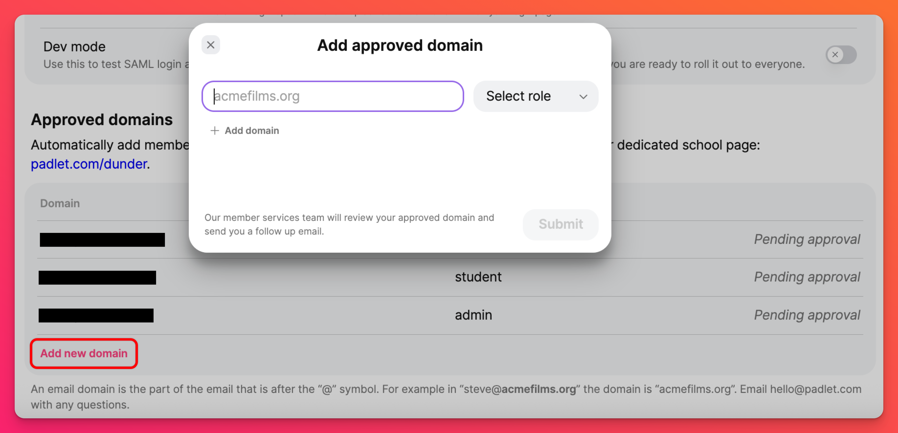 ClassLink 또는 Clever SSO를 활성화하면 학교의 패드렛 URL 또는 계정 내에서 생성된 패드렛을 방문하는 사용자에 대한 계정이 자동으로 생성됩니다. 학교용 패드렛 소유자는 이러한 상황에서 계정을 자동으로 생성할 특정 이메일 도메인을 결정할 수 있습니다.