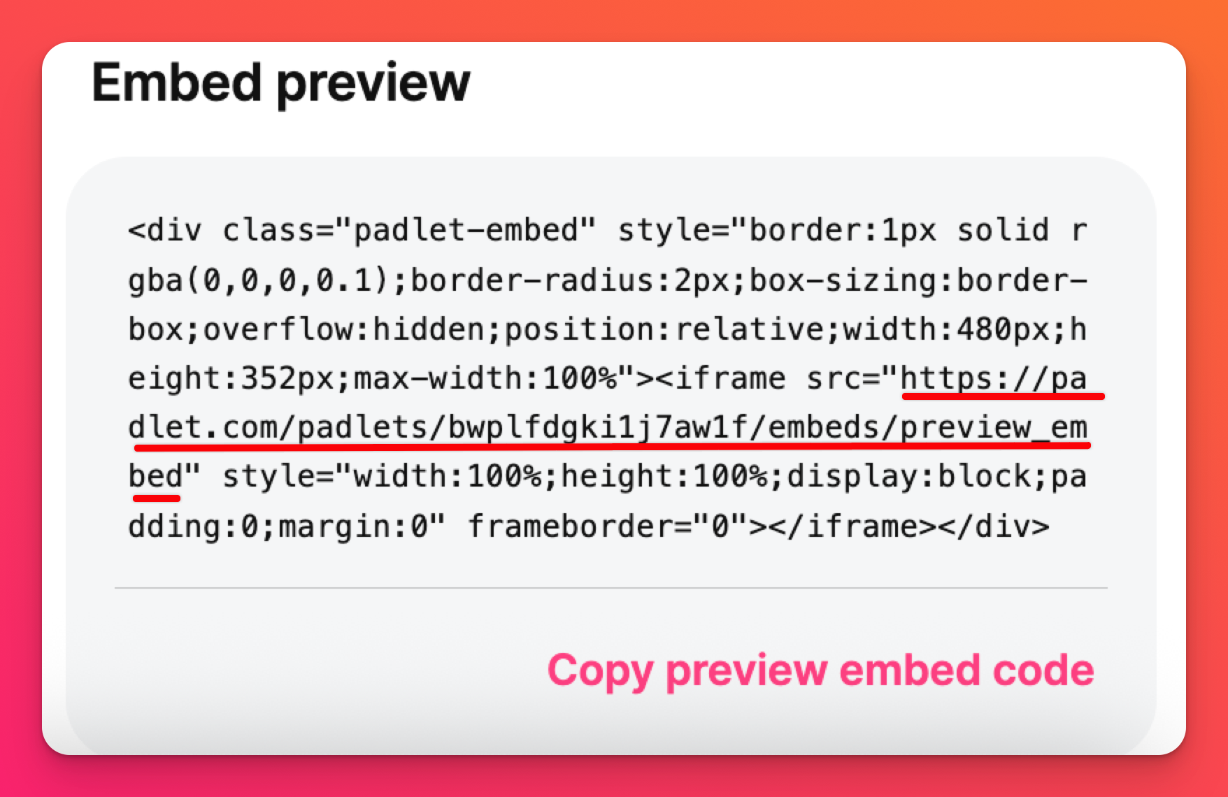3. I " Embed board" -koden eller "Embed preview" -koden finner du lenken innenfor anførselstegn etter at det står "iframe src".