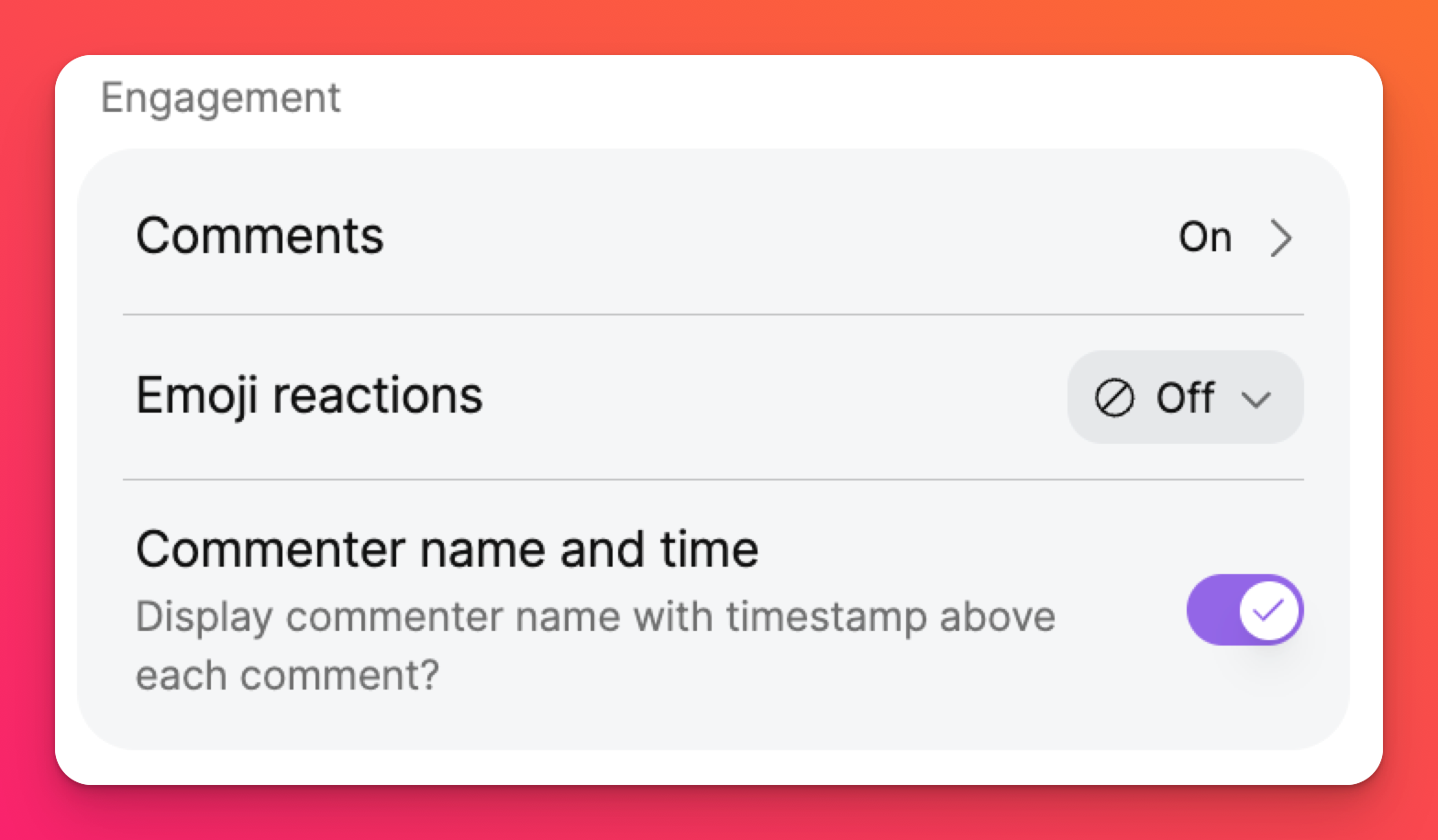 Dostępna jest również opcja „Reakcje emoji”! Wybierz, czy użytkownicy będą mogli reagować na posty dowolnymi emoji, czy też ograniczyć reakcje do konkretnych symboli, takich jak kciuk w górę, serce itp. Jeśli żadna z tych opcji nie jest dla Ciebie odpowiednia, po prostu wybierz opcję „Wyłącz”.