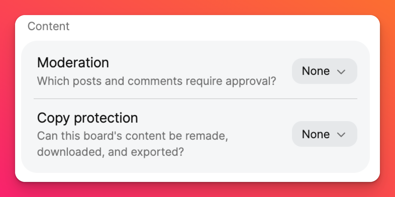 Istnieją trzy poziomy: Brak (brak moderacji), Auto (automatyczna moderacja oparta na sztucznej inteligencji) lub Ręczna (wszystkie posty wymagają zatwierdzenia przed wyświetleniem).