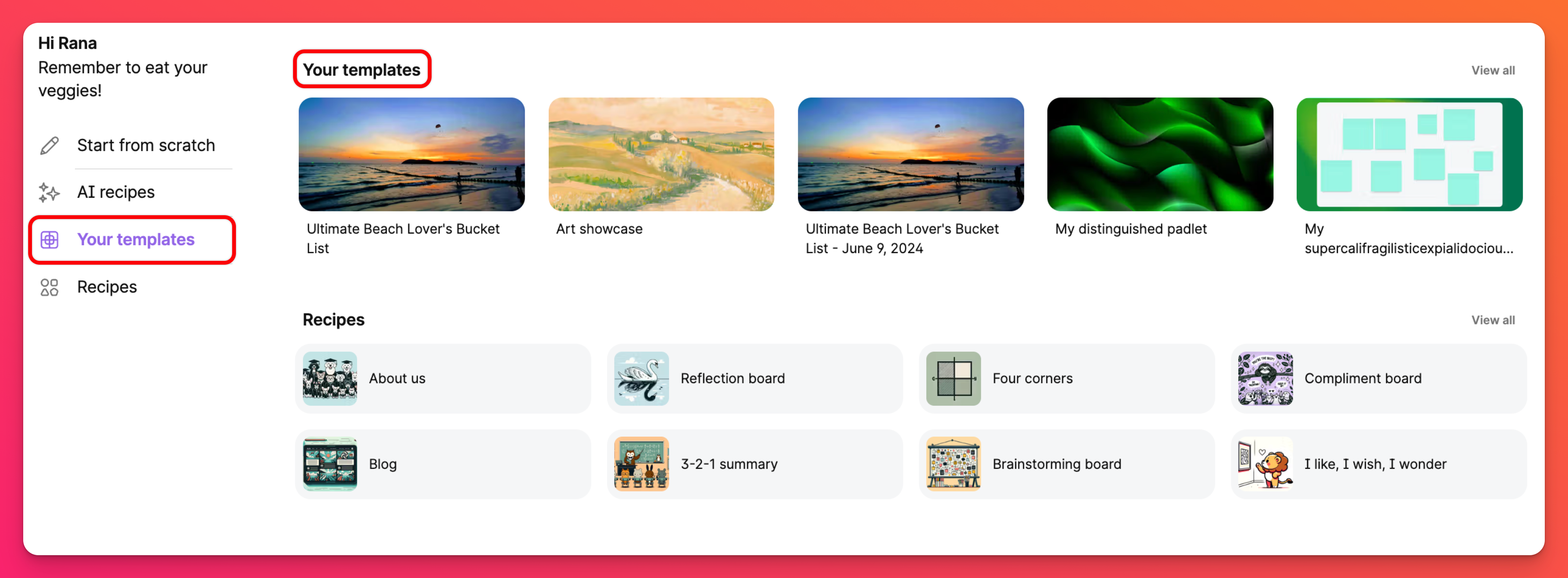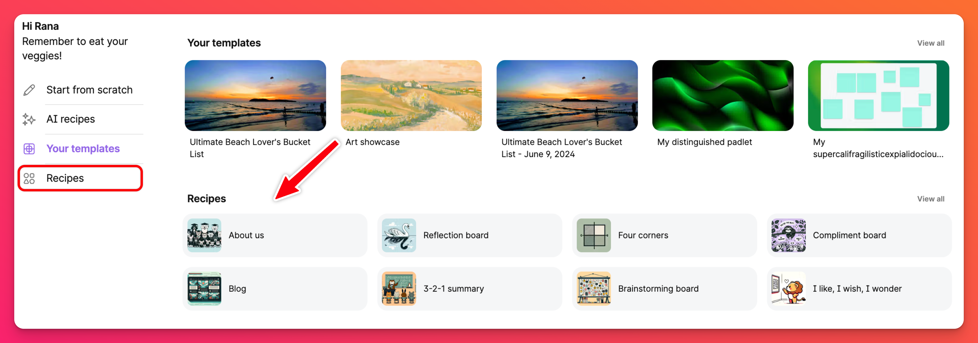 Nie masz ochoty tworzyć własnego szablonu? Skorzystaj z jednego z pięknie wykonanych, wstępnie wypełnionych szablonów z naszej sekcji „Przepisy”! Kliknij przycisk + Utwórz na pulpicie nawigacyjnym > Pod sekcją „Twoje szablony” zobaczysz sekcję Przepisy > Wybierz szablon!