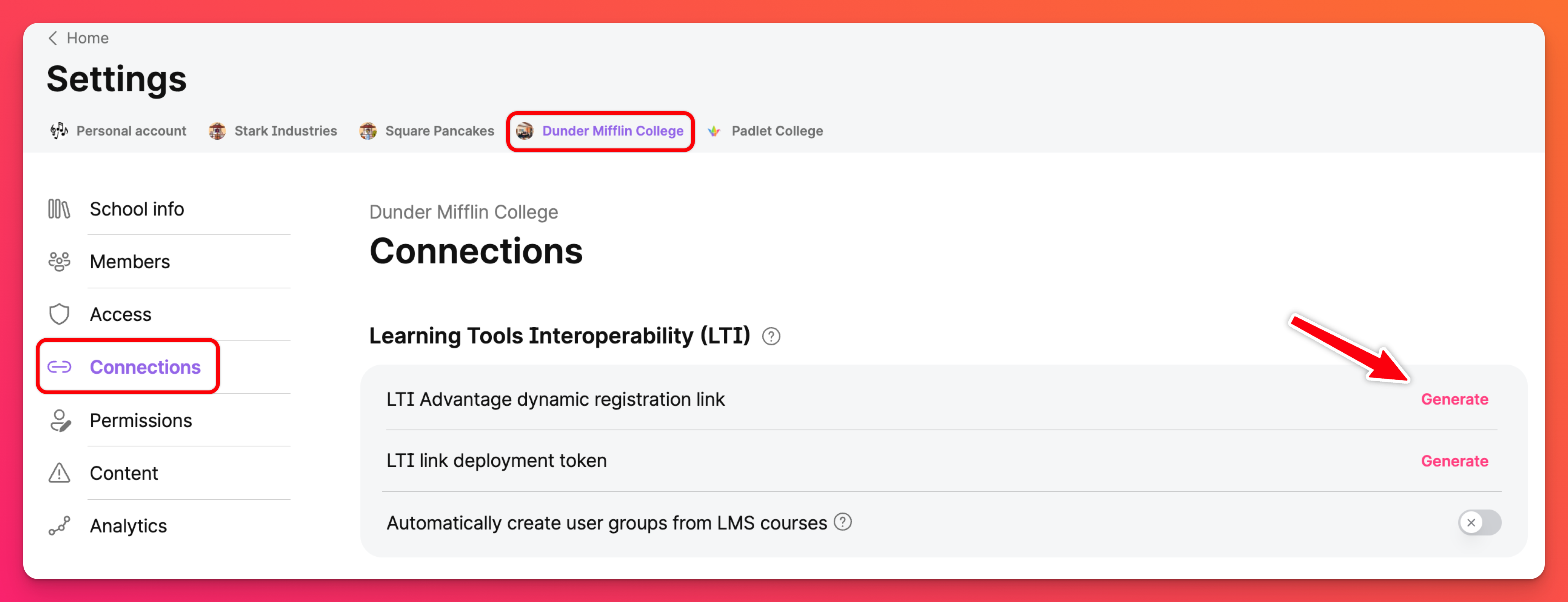 Faça login na sua conta do Padlet para Escolas com as credenciais de Proprietário. Em seguida, acesse a página Configurações clicando no ícone de engrenagem Configurações no canto superior direito > selecione a conta da escola (na parte superior) > Conexões > ao lado de 'Link de registro dinâmico do LTI Advantage', selecione Gerar > Copiar.