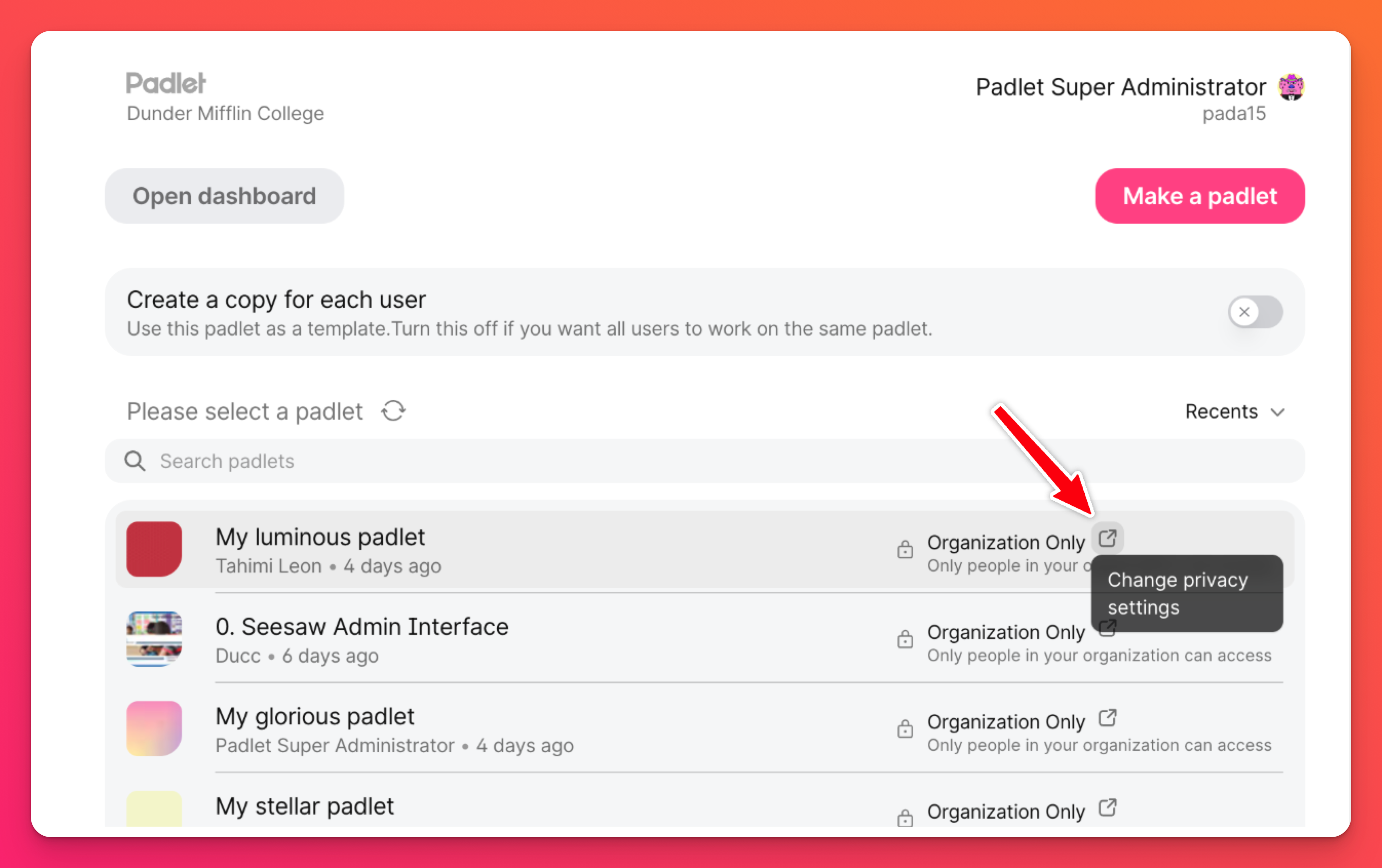 Ajuste as opções de privacidade ou de partilha (se necessário), clicando no botão de seta para navegar para o padlet, abrir o painel Partilhar e efetuar as actualizações.