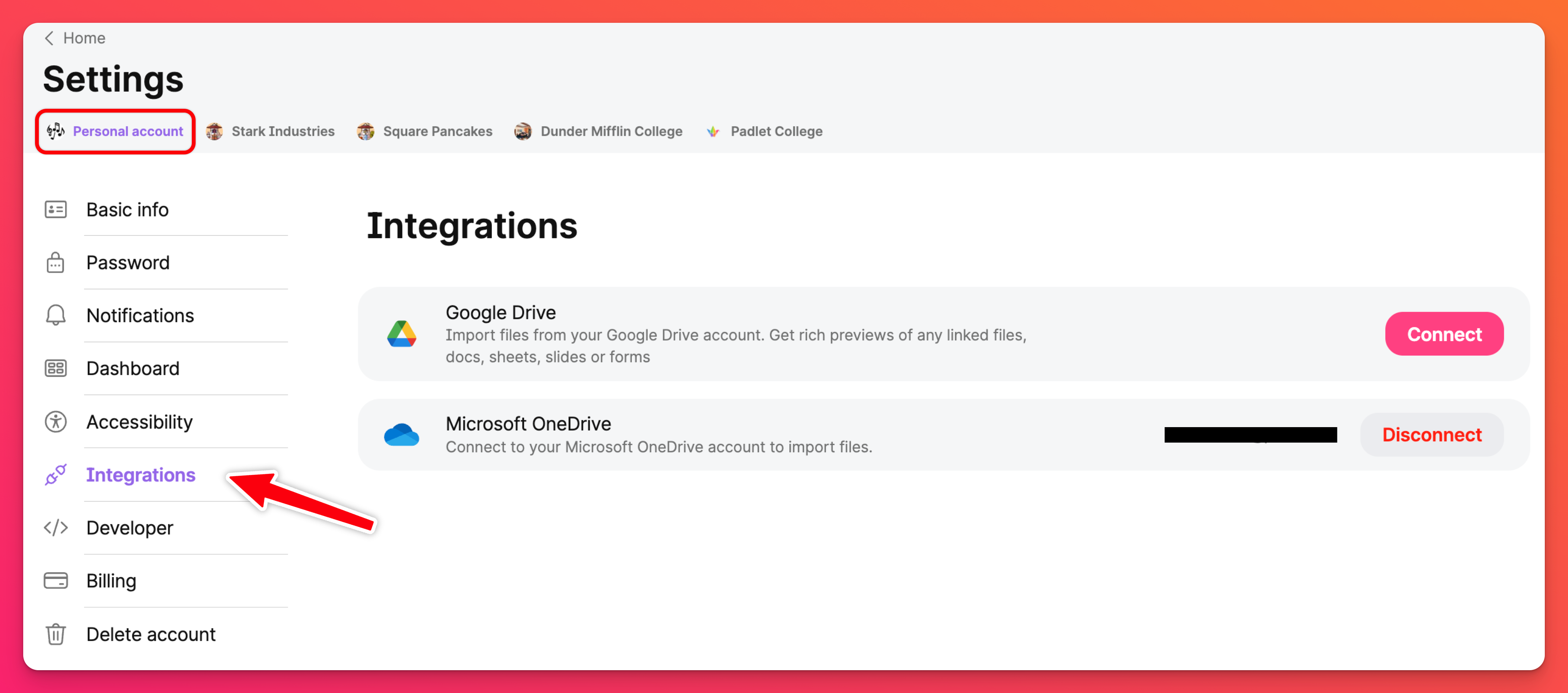 - Убедитесь, что выбран Личный аккаунт (в верхней части страницы), затем выберите Интеграции