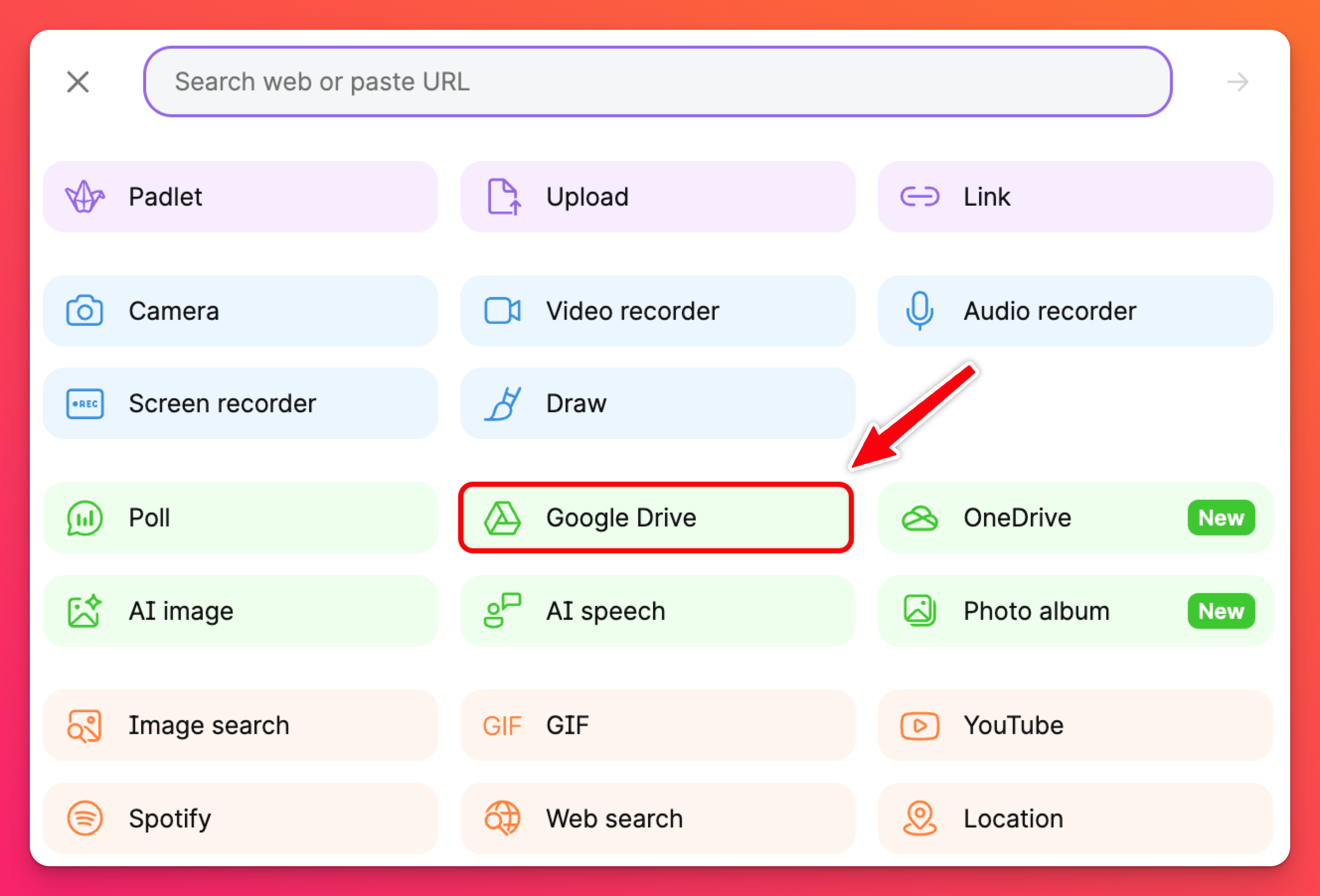 Вы можете связать свой Google Диск с аккаунтом Padlet. Как только интеграция будет завершена, вы сможете просматривать свой аккаунт Google Drive и прикреплять элементы прямо в свой Padlet!