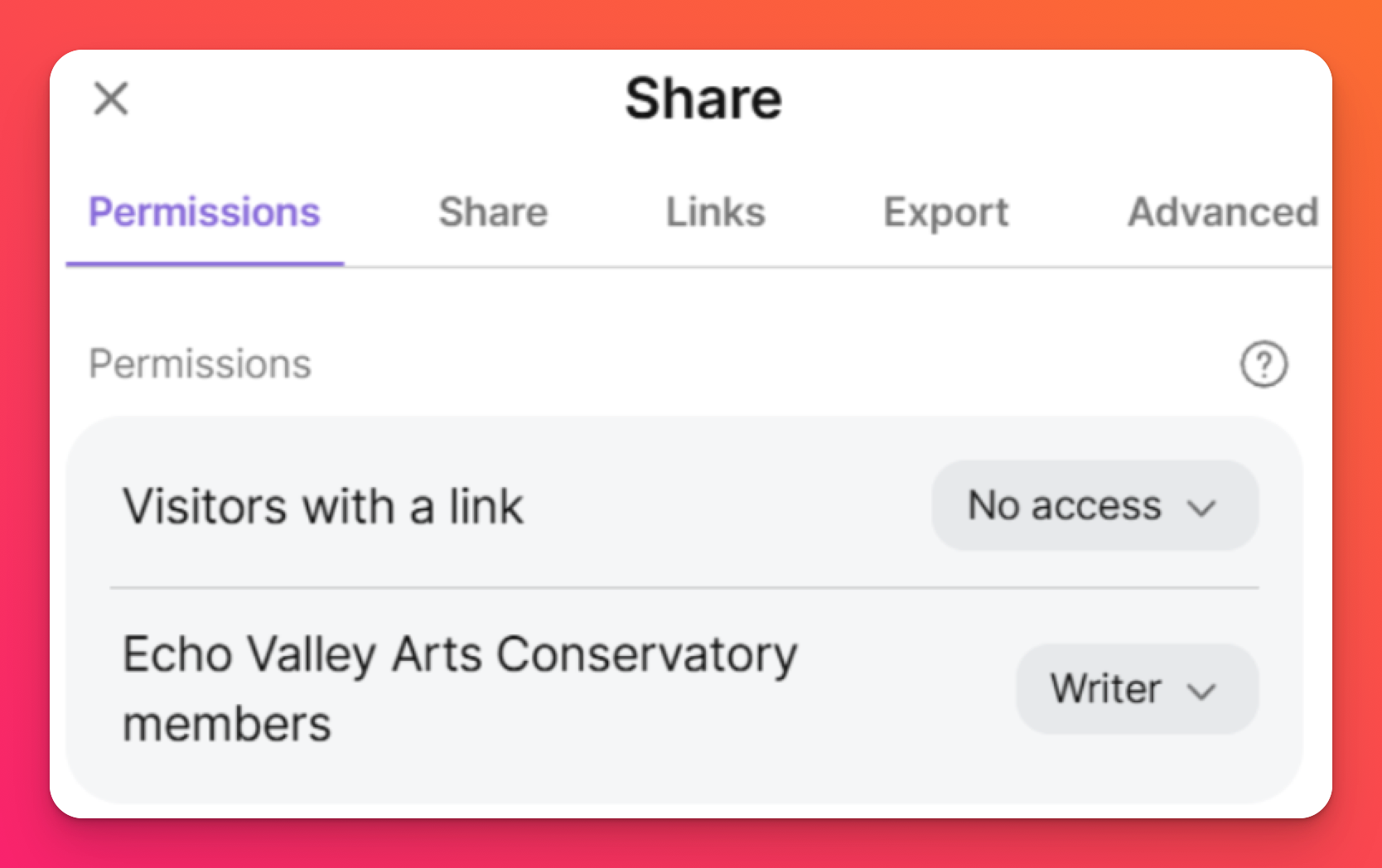 При необходимости вы можете настроить эти разрешения. Например, вы можете разрешить посетителям со ссылкой доступ "Читатель" вместо "Нет доступа" или предоставить членам рабочего пространства более высокие права, такие как "Модератор" или "Администратор".