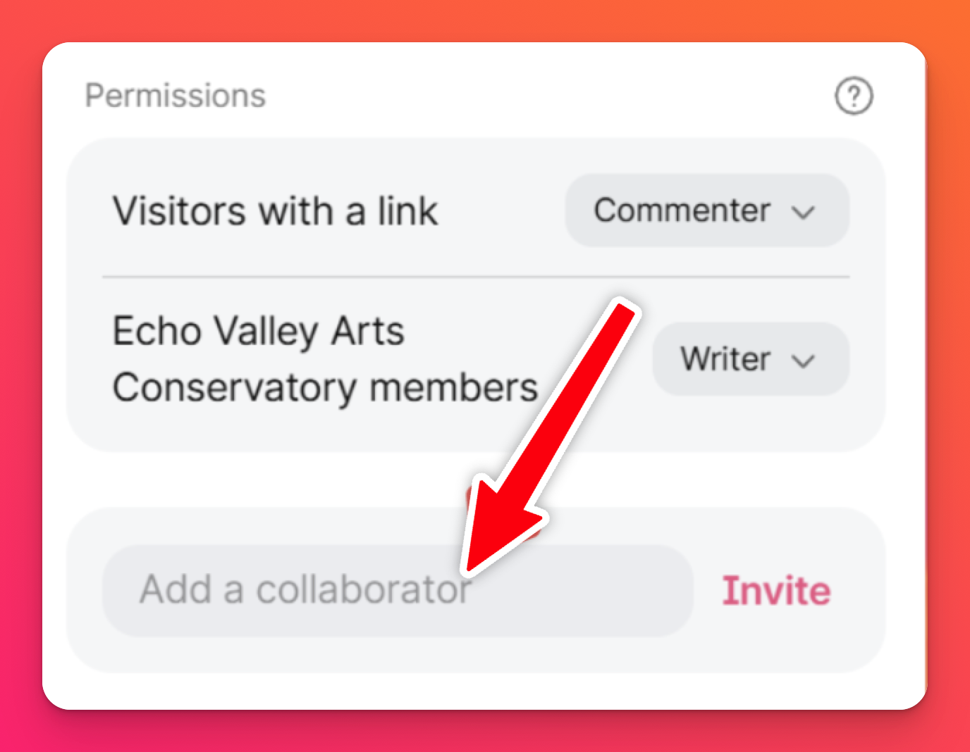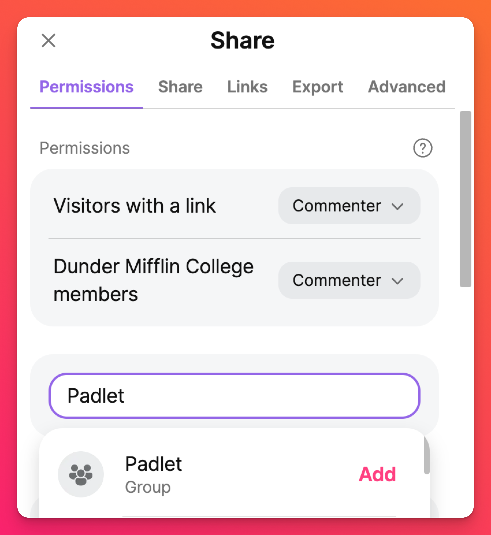 Добавление соавторов в ваш падлет - отличный способ предоставить индивидуальные права. Например, если вы хотите, чтобы ваш падлет был настроен на Commenter (чтобы пользователи могли оставлять комментарии только к существующим сообщениям падлета), но есть несколько человек, которым вы хотели бы предоставить права Writer, вы можете добавить их в качестве коллабораторов, чтобы предоставить им свои собственные уникальные права. Узнайте, как добавить соавторов в свой падлет здесь!