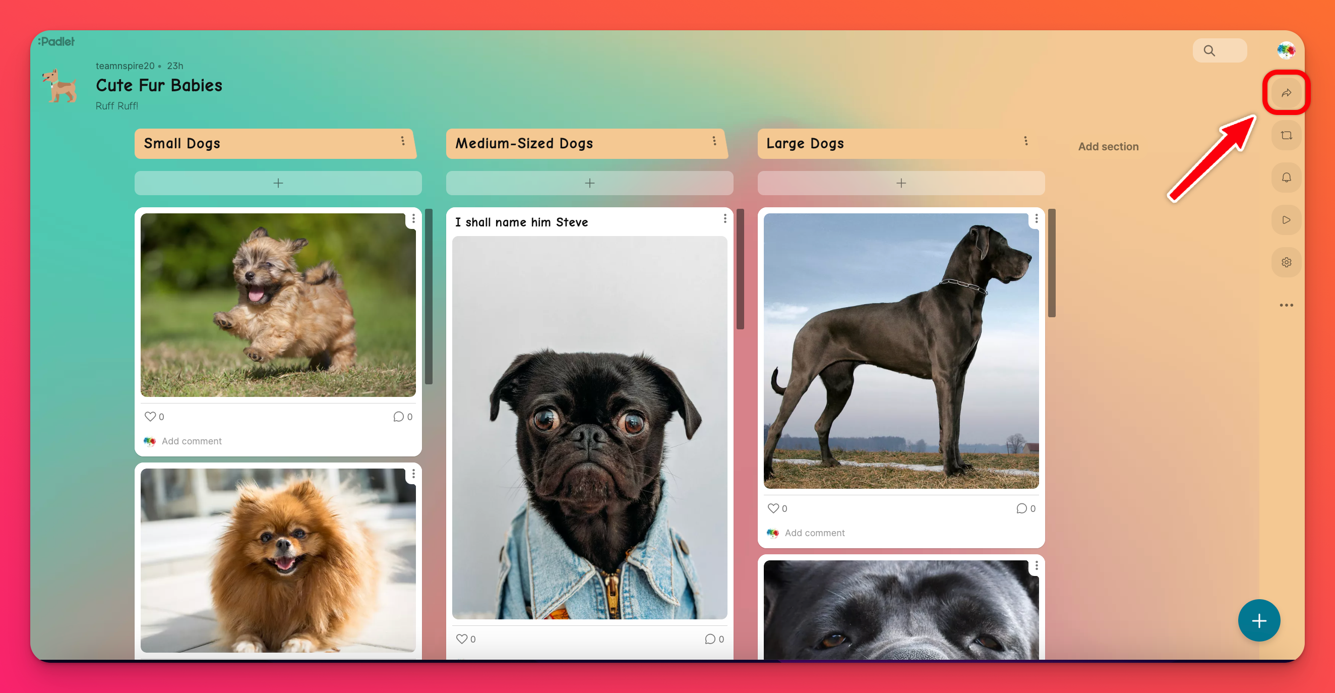 - Находясь в своем падлете, откройте настройки, нажав на кнопку со стрелкой Share.